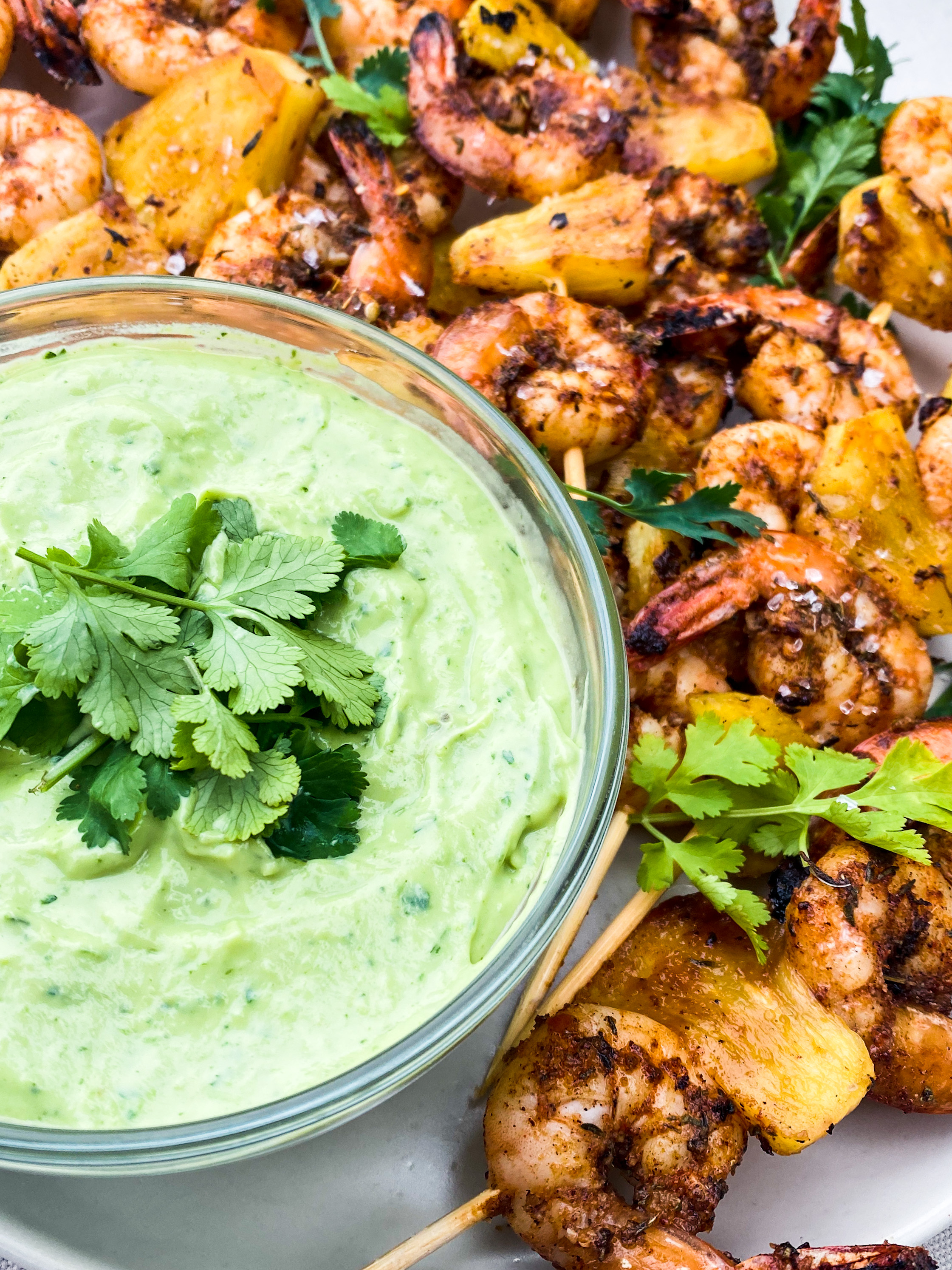 So there you have it, my inspiration for skipping buffalo dip and saying helloooo to a much healthier and much tastier appetizer — Jerk Shrimp + Pineapple Skewers. And just because we fancy, I made a quick Avocado Lime Crema to dip the shrimp and pineapple into.