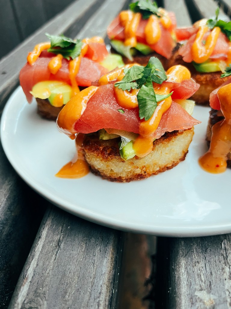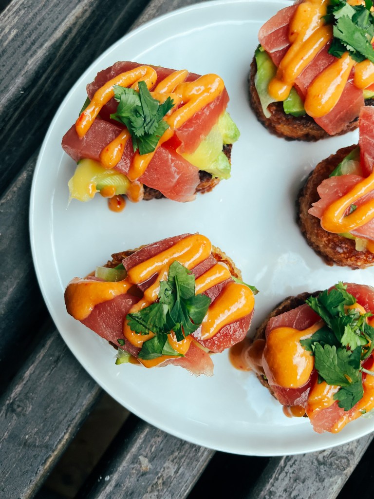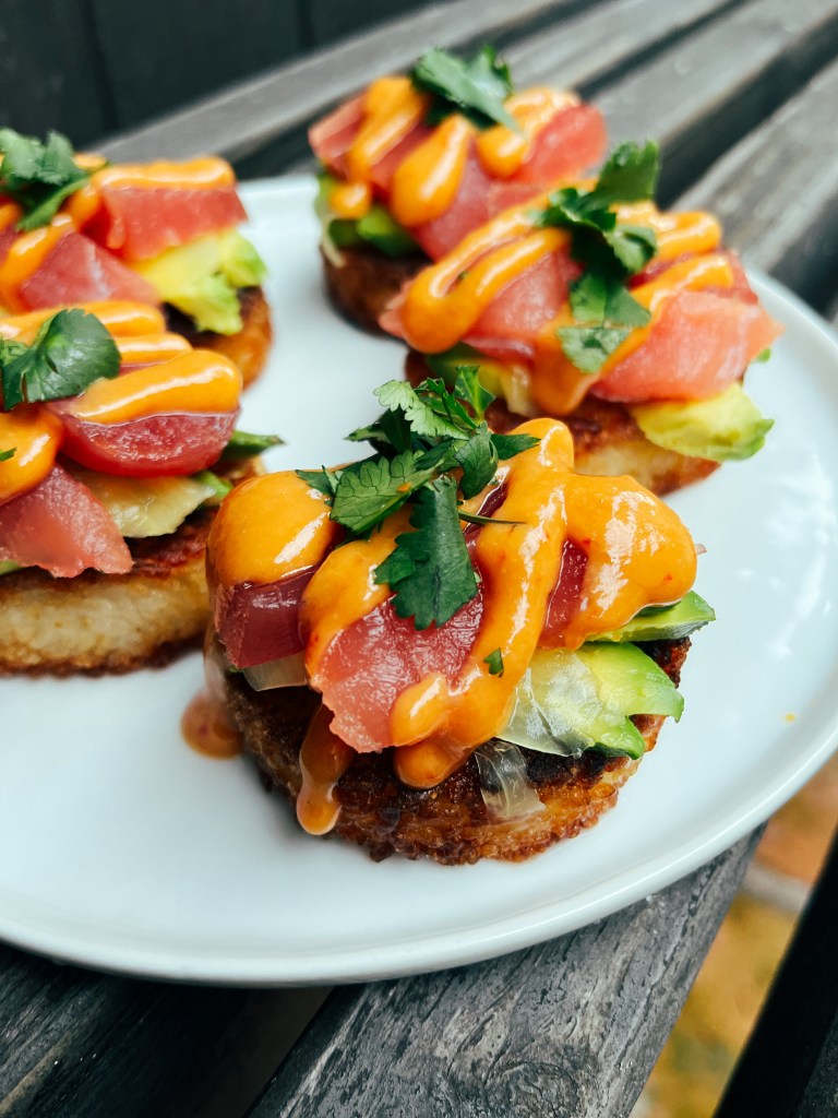 - Stack avocado, pickled ginger, and tuna on top of the crispy rice.
