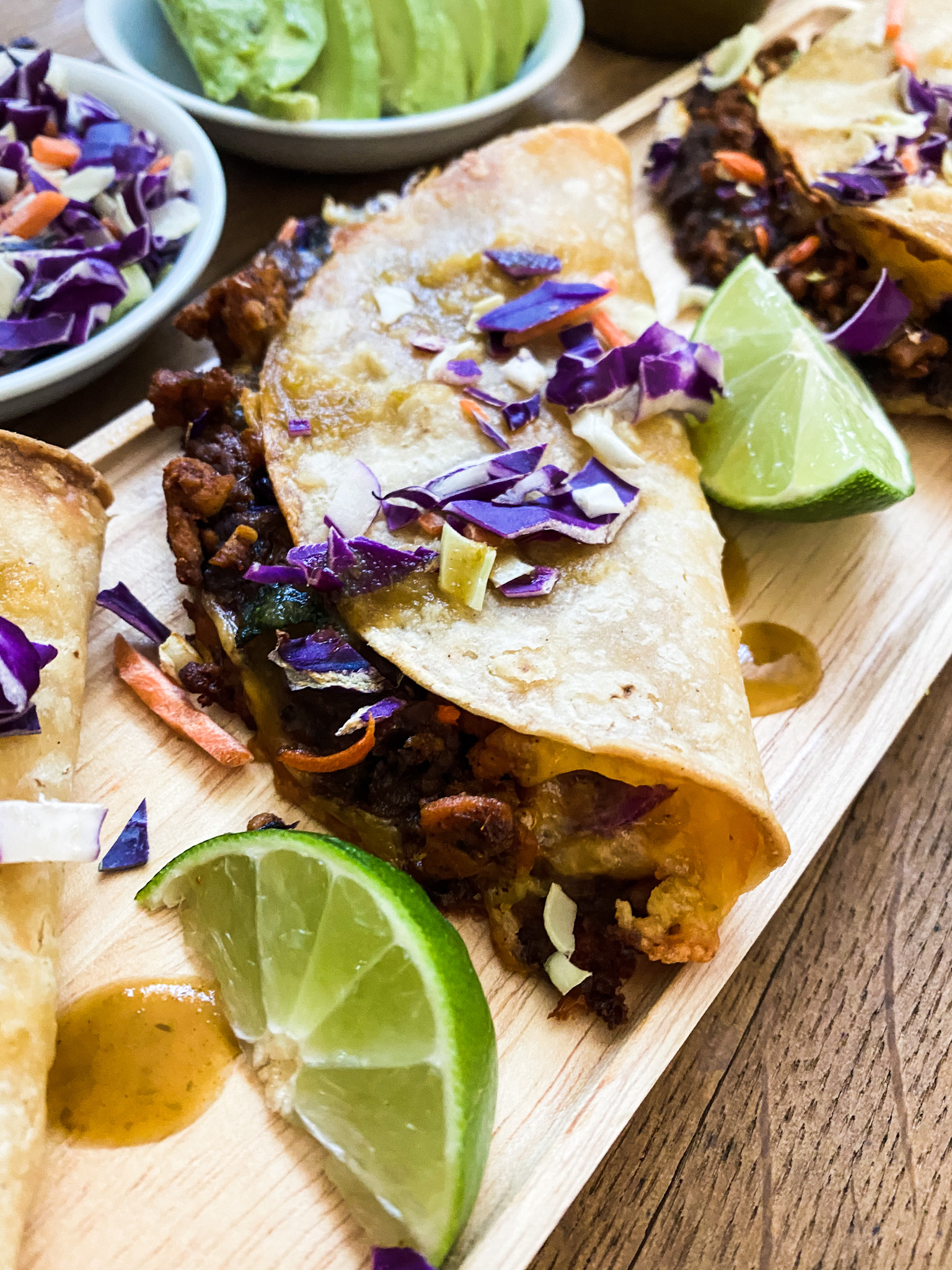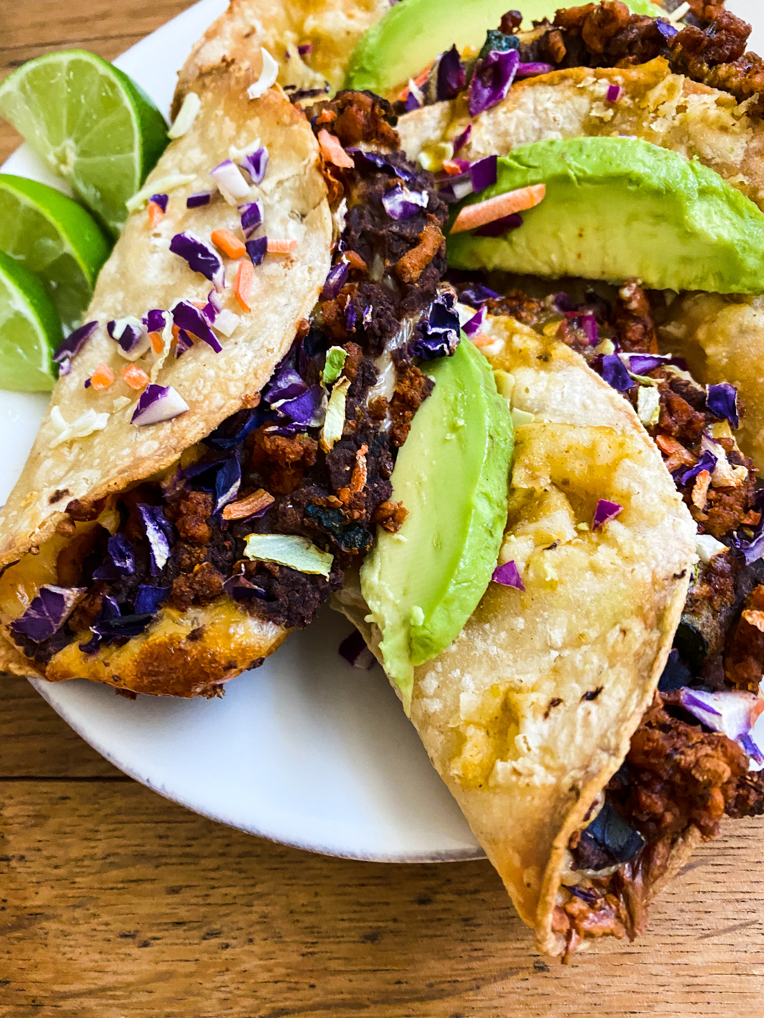Bake corn tortillas for 1-2 minutes in the oven while you preheat so it’s malleable and won’t break when you fold it over the insides. Load up your tacos, place them on a baking sheet, then COVER the tacos with a baking/cookie rack. It will keep the tortillas from curling up while it bakes and crisps. Don’t worry, 99% of cookie racks are oven safe and completely secure your tacos so you can forgo anything store-bought or fried but still have crispy, completely put-together together.