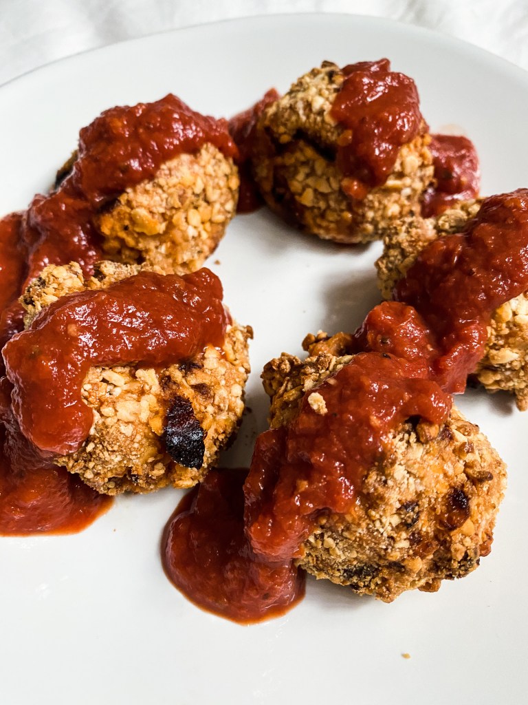 I used extra spicy sausage and frozen riced cauliflower to make a thick gooey inside, then dipped eat one into a quick egg wash with GF breadcrumbs and BAM, you have Italian-style Arancini balls.