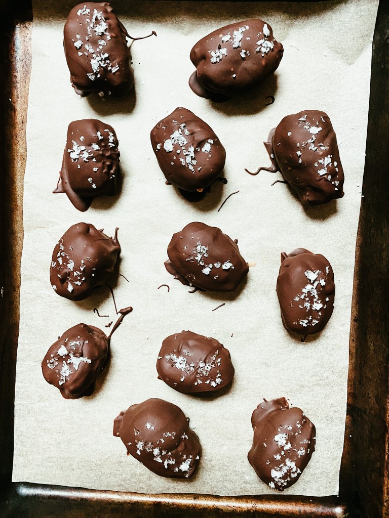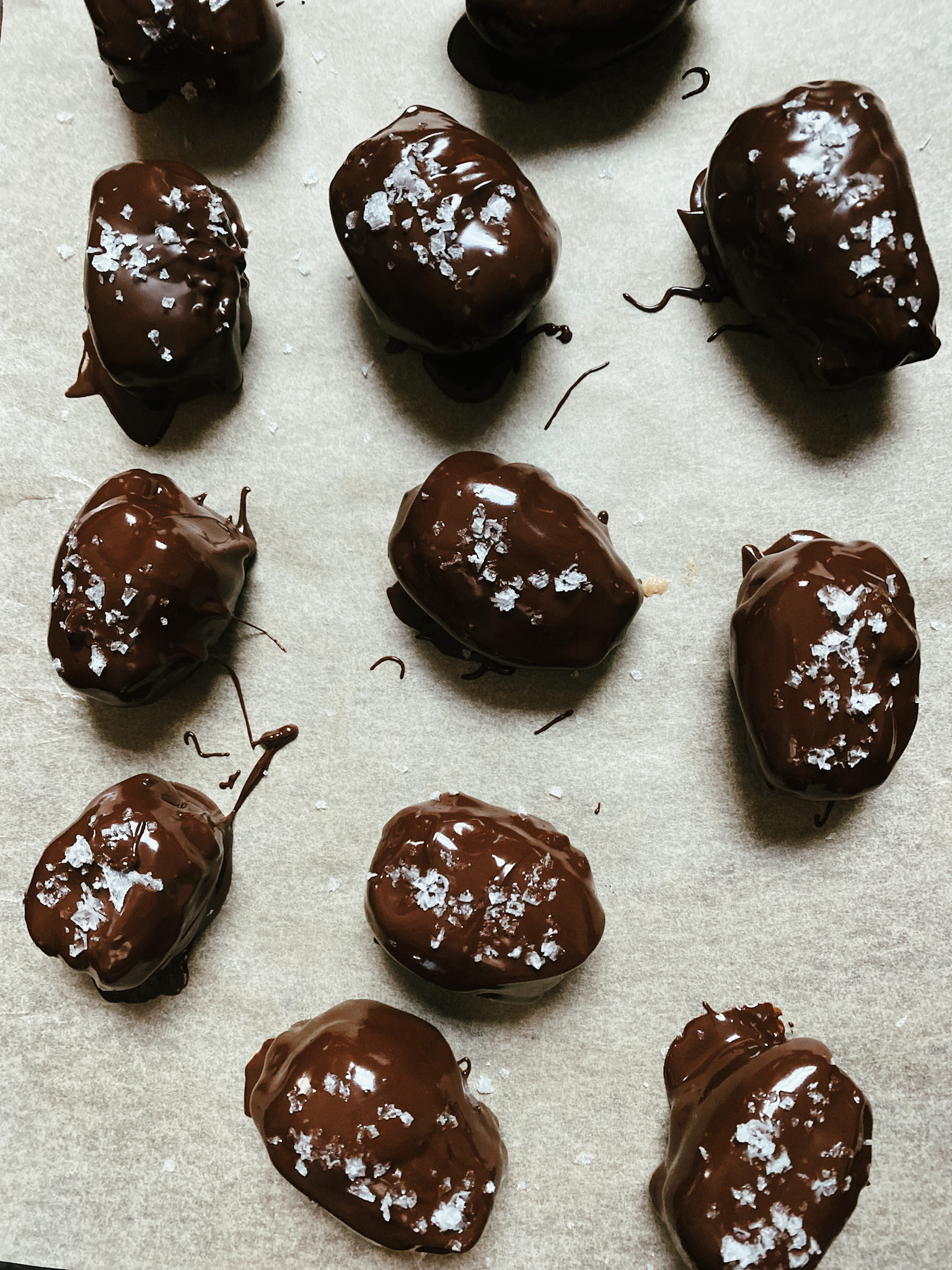Simply stuff pre-pitted Medjool dates with your choice of nut butter (I went classic with Justin’s creamy peanut butter), place a peanut or two on top, toss in melted chocolate (I went with a mix of dark and milk), sprinkle some sea salt flakes on top, then freeze! Literally that easy. And really does taste like Snickers. It’s wild but the date texture substitutes in for the caramel layer of a Snickers and BAM – it’s surprisingly close to the classic candy.
