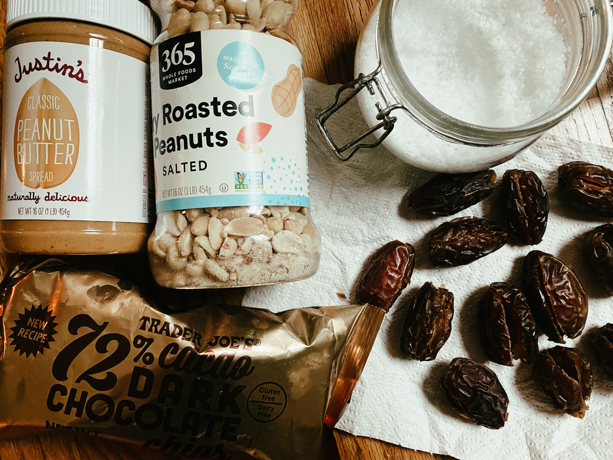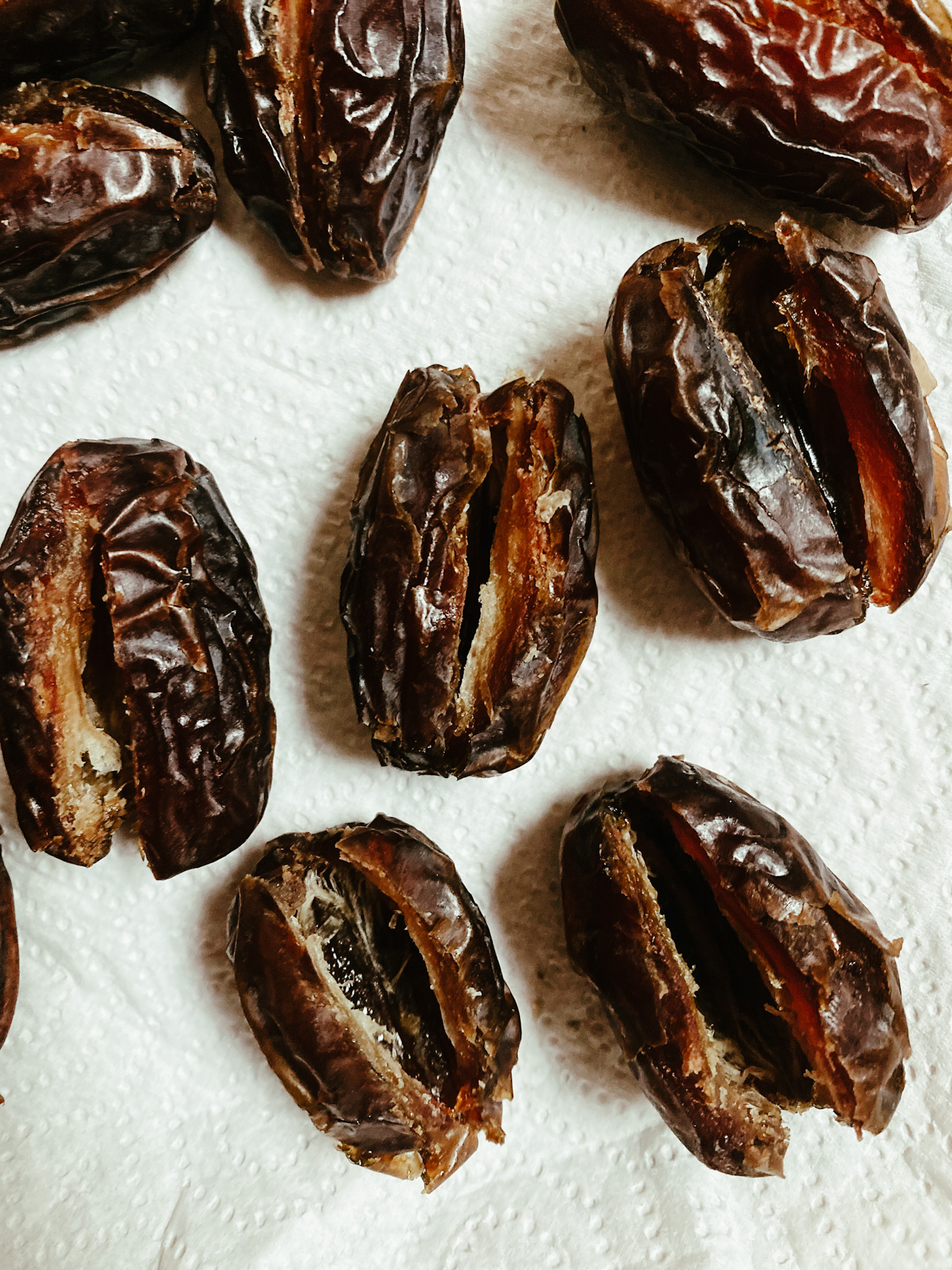- Using a small spoon, fill Medjool dates with a dollop of peanut butter as if the peanut butter was the pit, and filling it makes the date round.