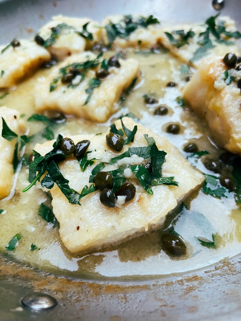 In theory, you could use any type of white fish for this dish but I prefer to use cod or halibut given they are a bit sturdier, thicker, and easier when man-handling between the egg wash and the quick flour powder.