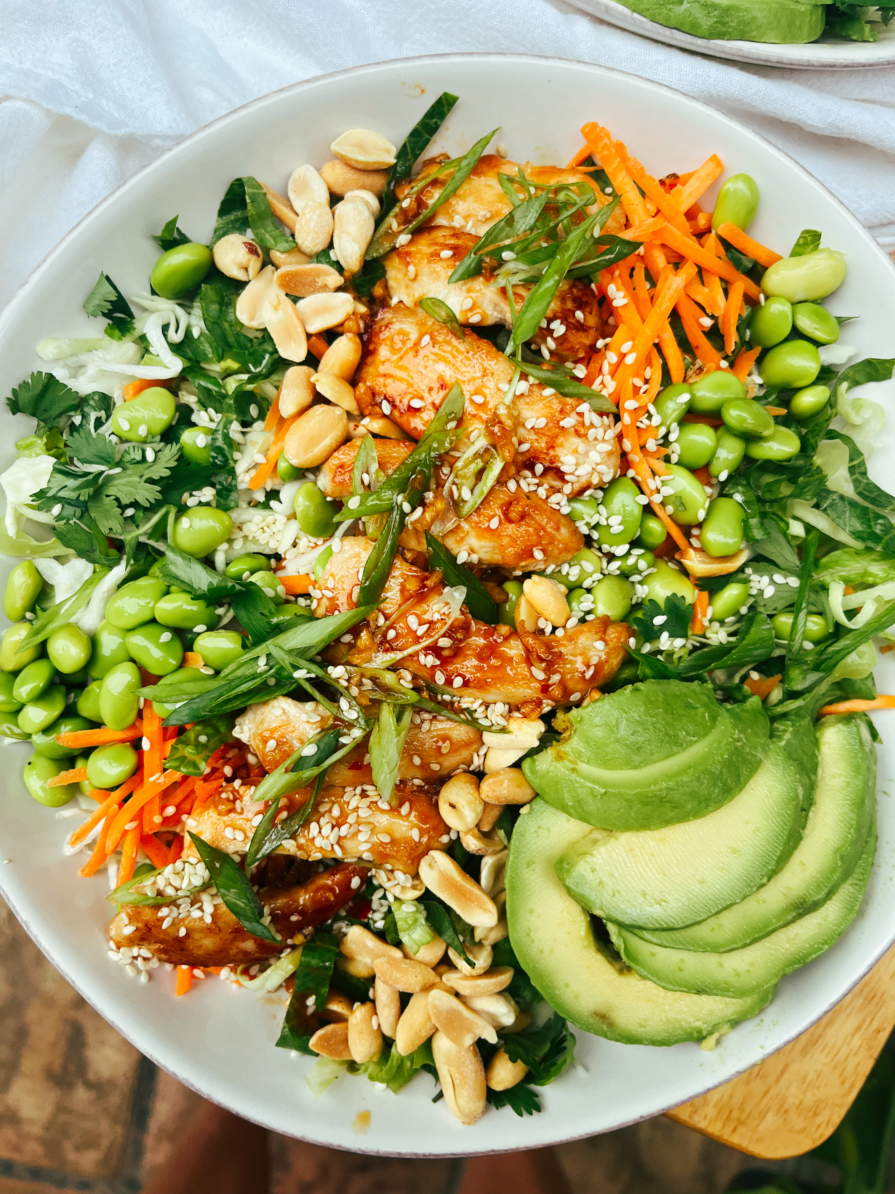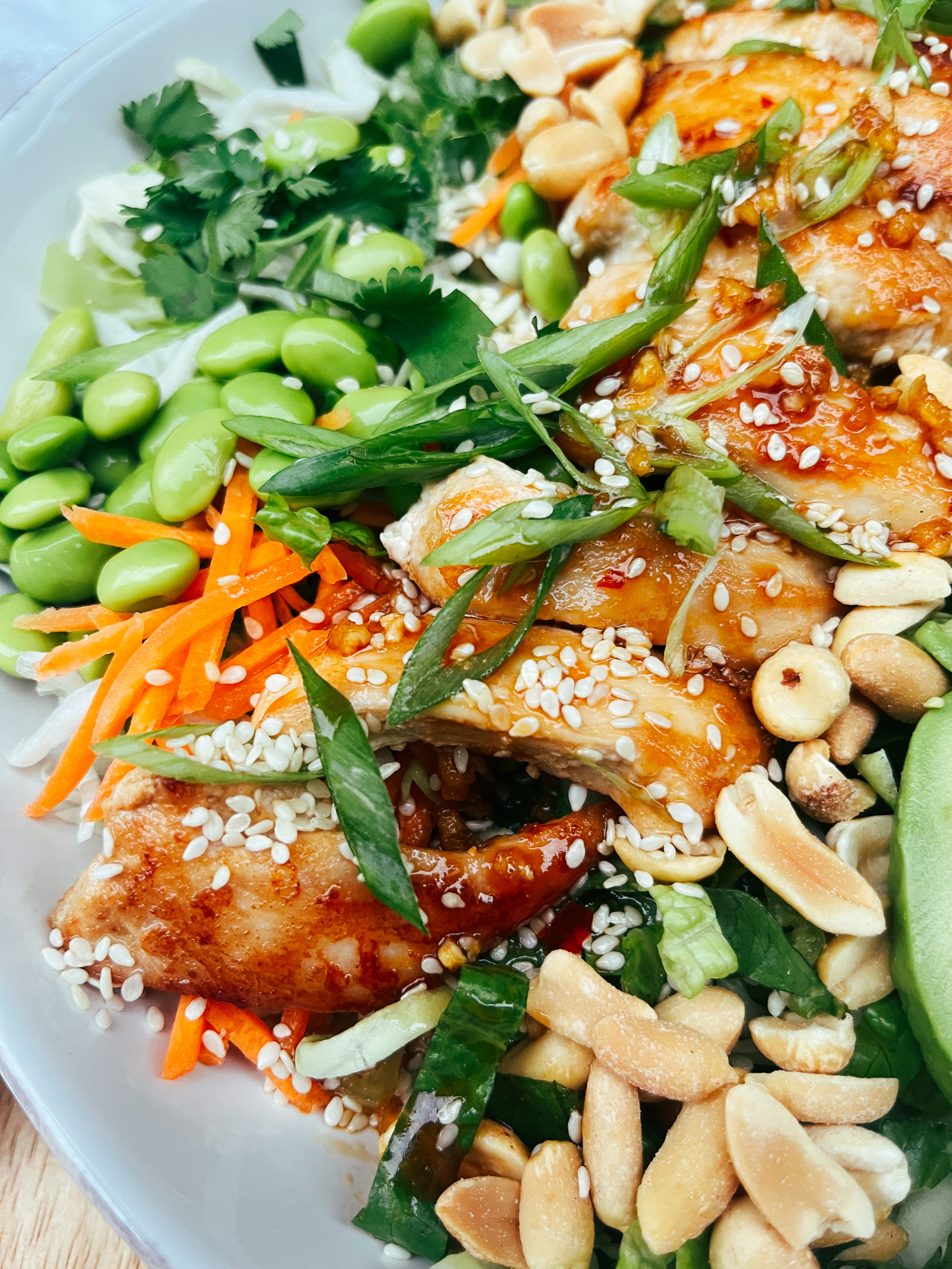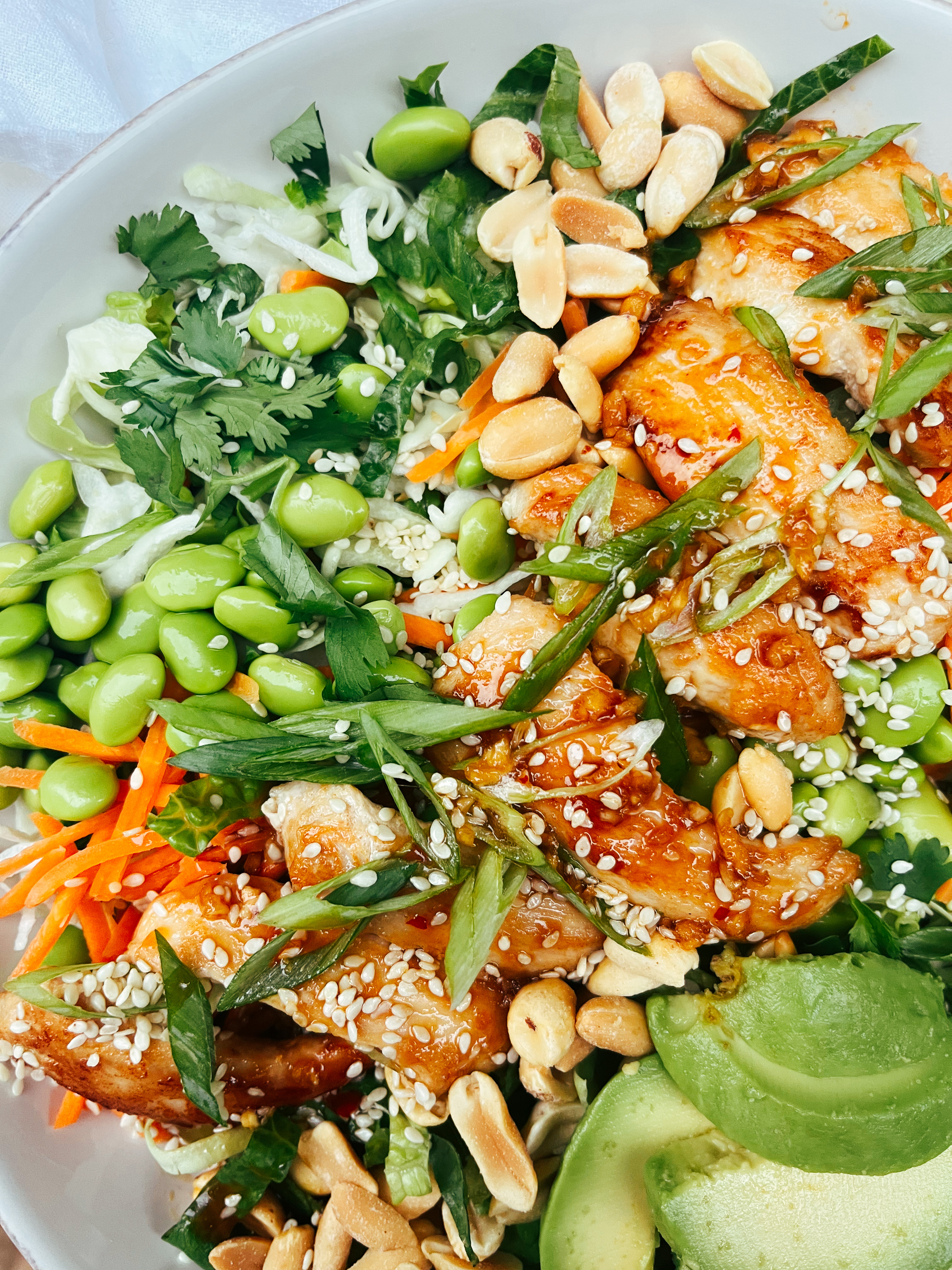- Top with edamame, peanuts, avocado, and extra sesame seeds.