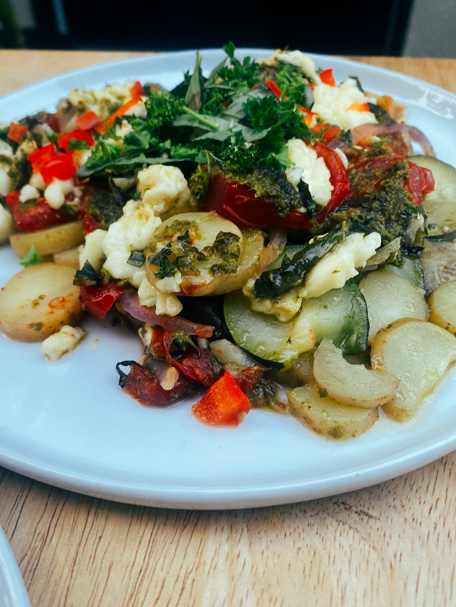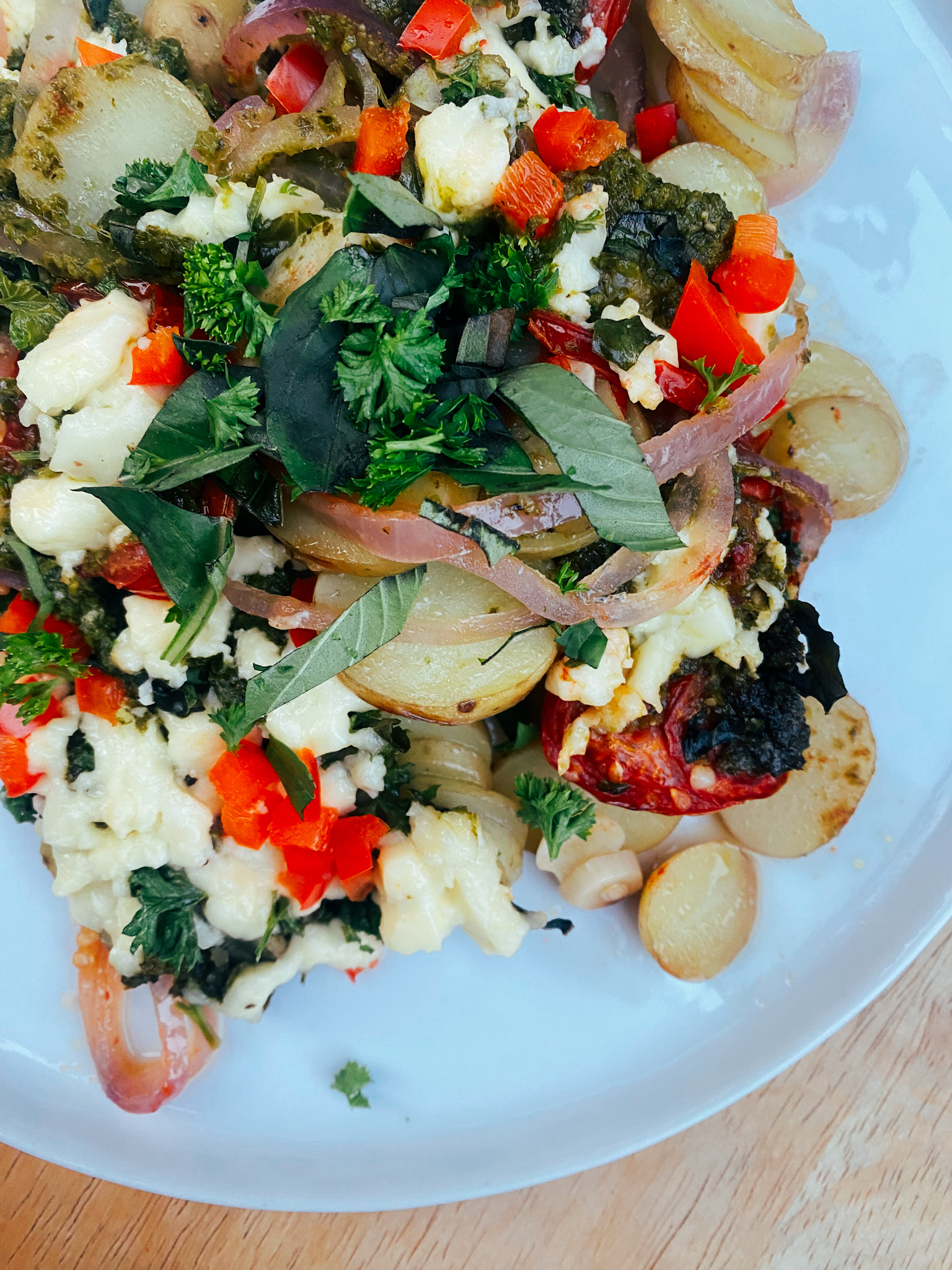 We can all thank my mom for sourcing the inspiration for this dish! Clipped from a local paper, I took a traditional Greek casserole recipe and upped the ante with of course, my favorite, pesto. Besides chopping all the ingredients, it’s super simple to put together. So prep the vegetables ahead of time and when you’re feeling lazy about cooking, layer them all together and throw it in the oven! It’s loaded with vegetables, nutrient-dense (which keeps you full longer), and could be considered an entree or a side.