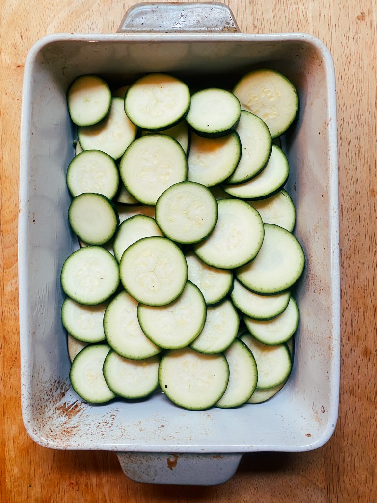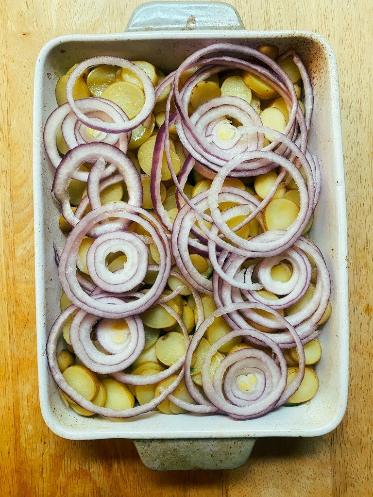 - Slice potatoes, zucchini, onion, and eggplant into ¼ inch rounds. Set aside for assembly.