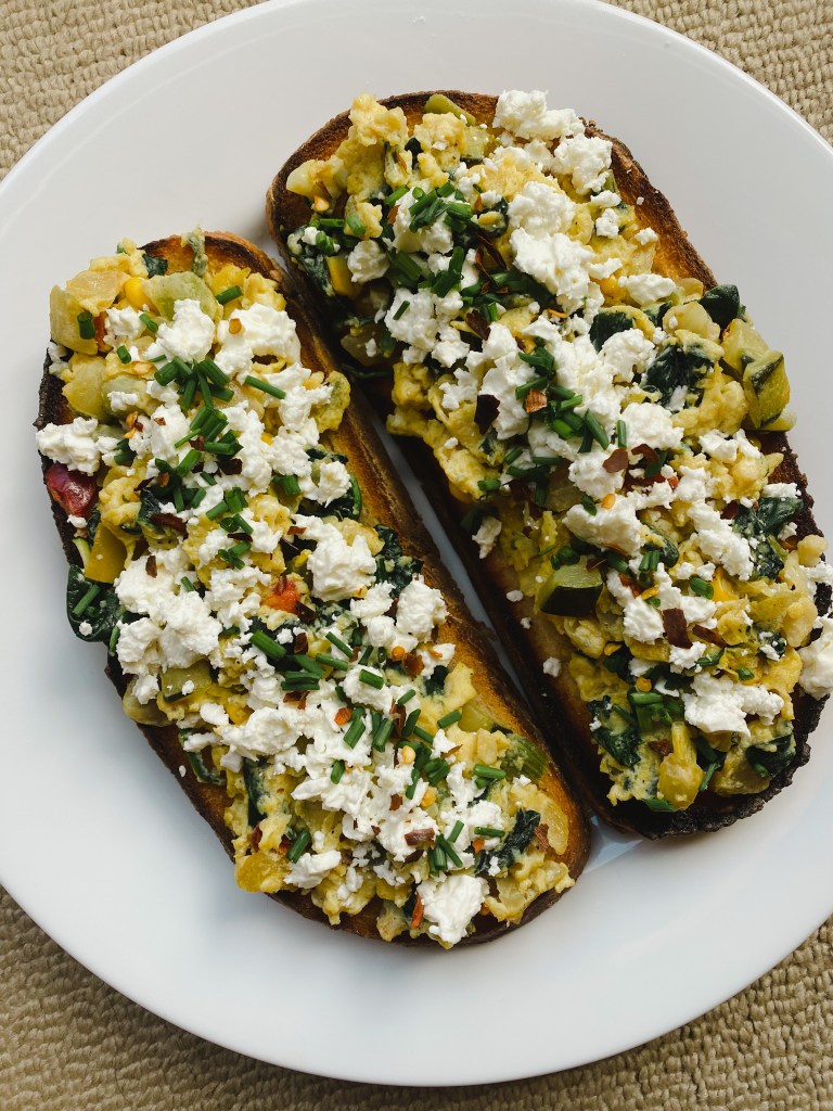 - Add eggs, feta, chives, chili flakes, salt and pepper on top of toast.