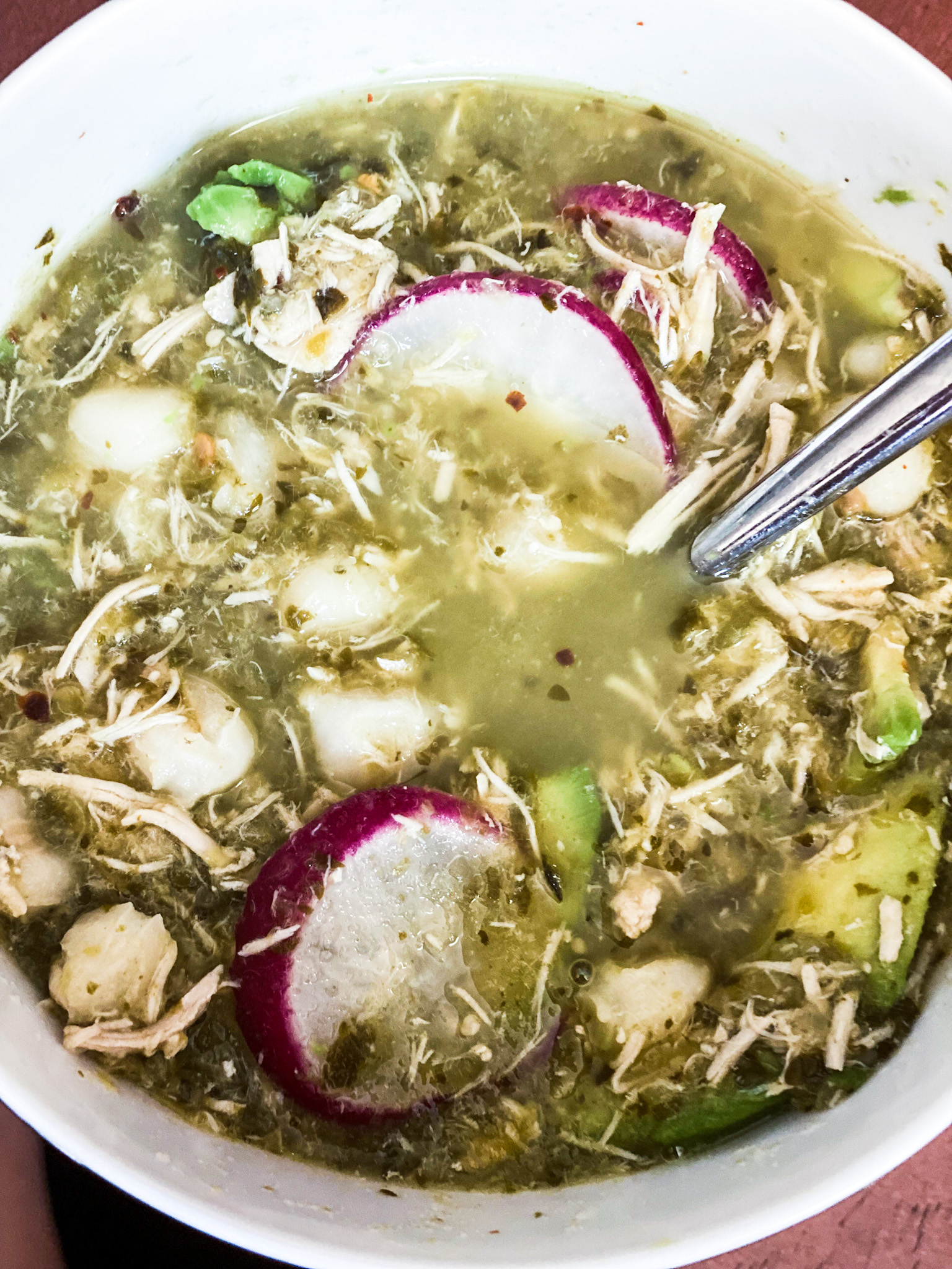 Pozole has always been a special treat for me. For a long time growing up, my maternal grandparents lived in Santa Fe, New Mexico. A magical place with green chili everything, enchiladas to die for, fascinating art, loads of turquoise jewelry, and cozy stucco homes. We would visit in the summer for long days at the pool, horseback riding lessons, and cruising bikes around the neighborhood. And we’d visit during the winter for holidays filled with mini snowmen and of course, FOOD.