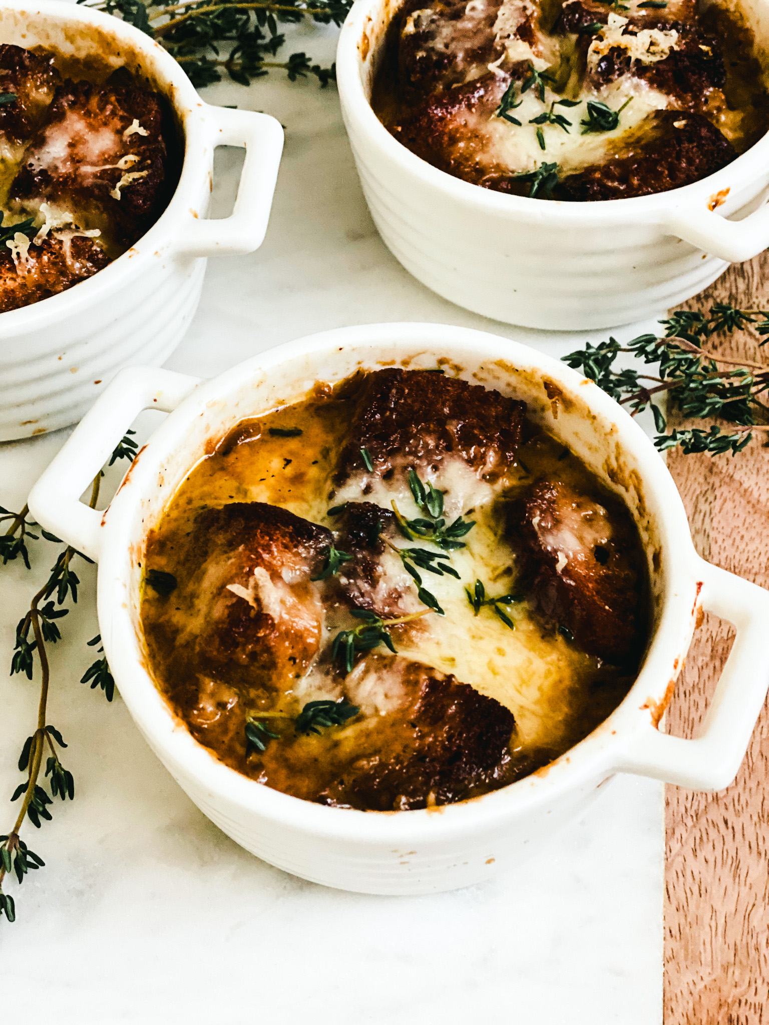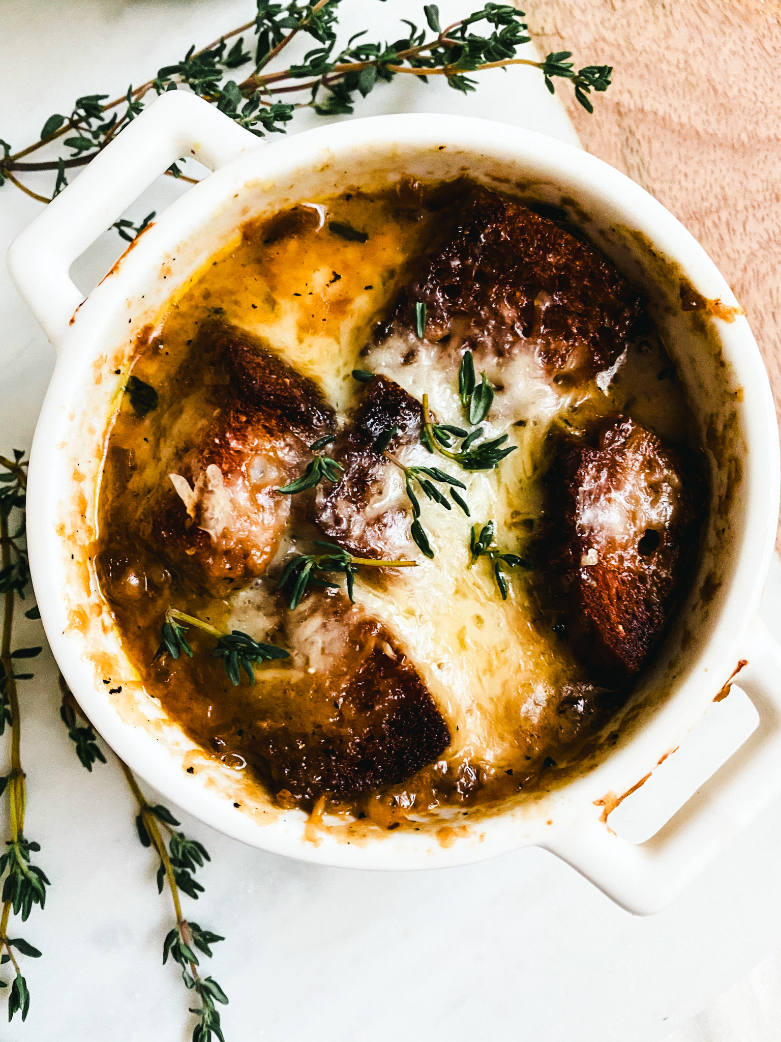 If there is one dish that I randomly crave A LOT and can almost never get at a restaurant is French Onion Soup. Who doesn’t love a big bowl of salty caramelized onions with a load of cheese and bread on top?