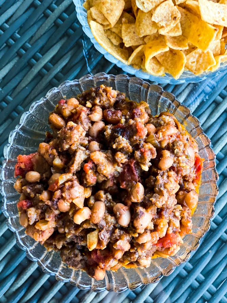 Obviously we like to scoop this hearty dish up with Fritos because why not? It’s the best combination of crunchy, salty chips and warm, gooey dip that will fill you up and hopefully bring you good luck. I like to make it once a year to keep it a special holiday tradition but by all means… make it for EVERY football Sunday. It’s a great addition to the football food lineup and goes down well with a cold beer.
