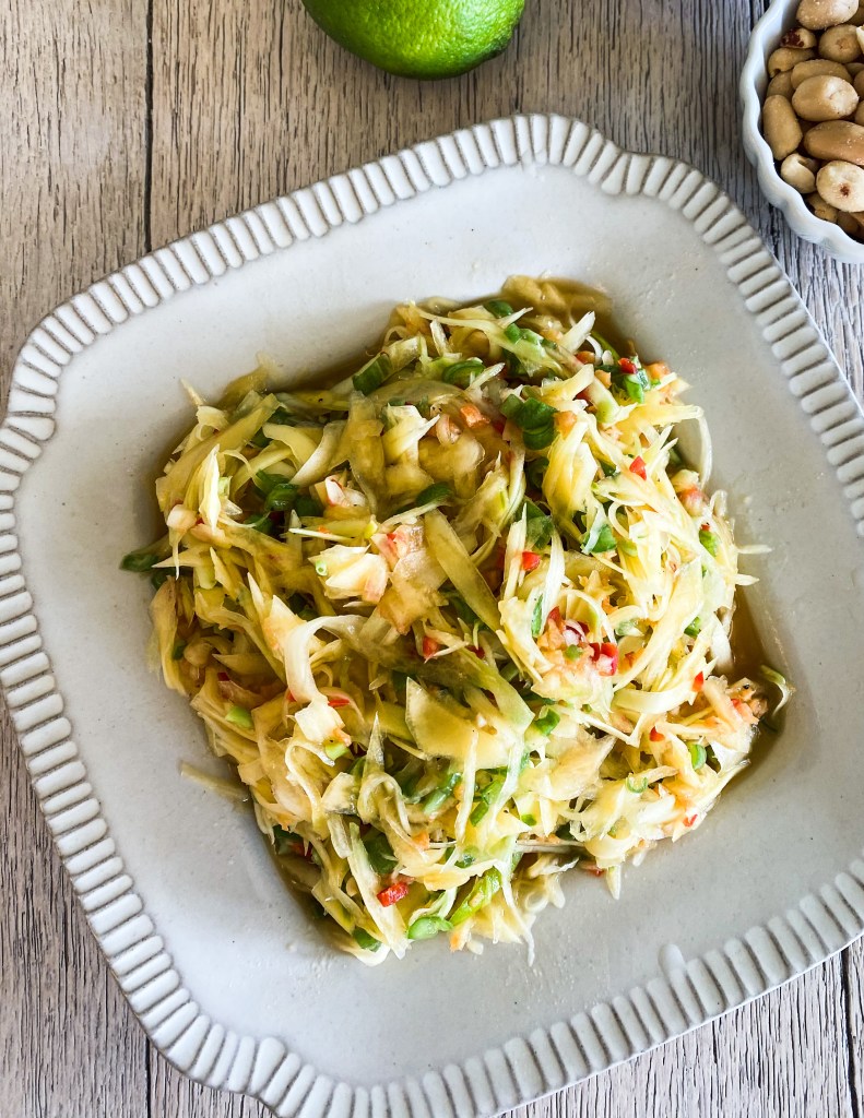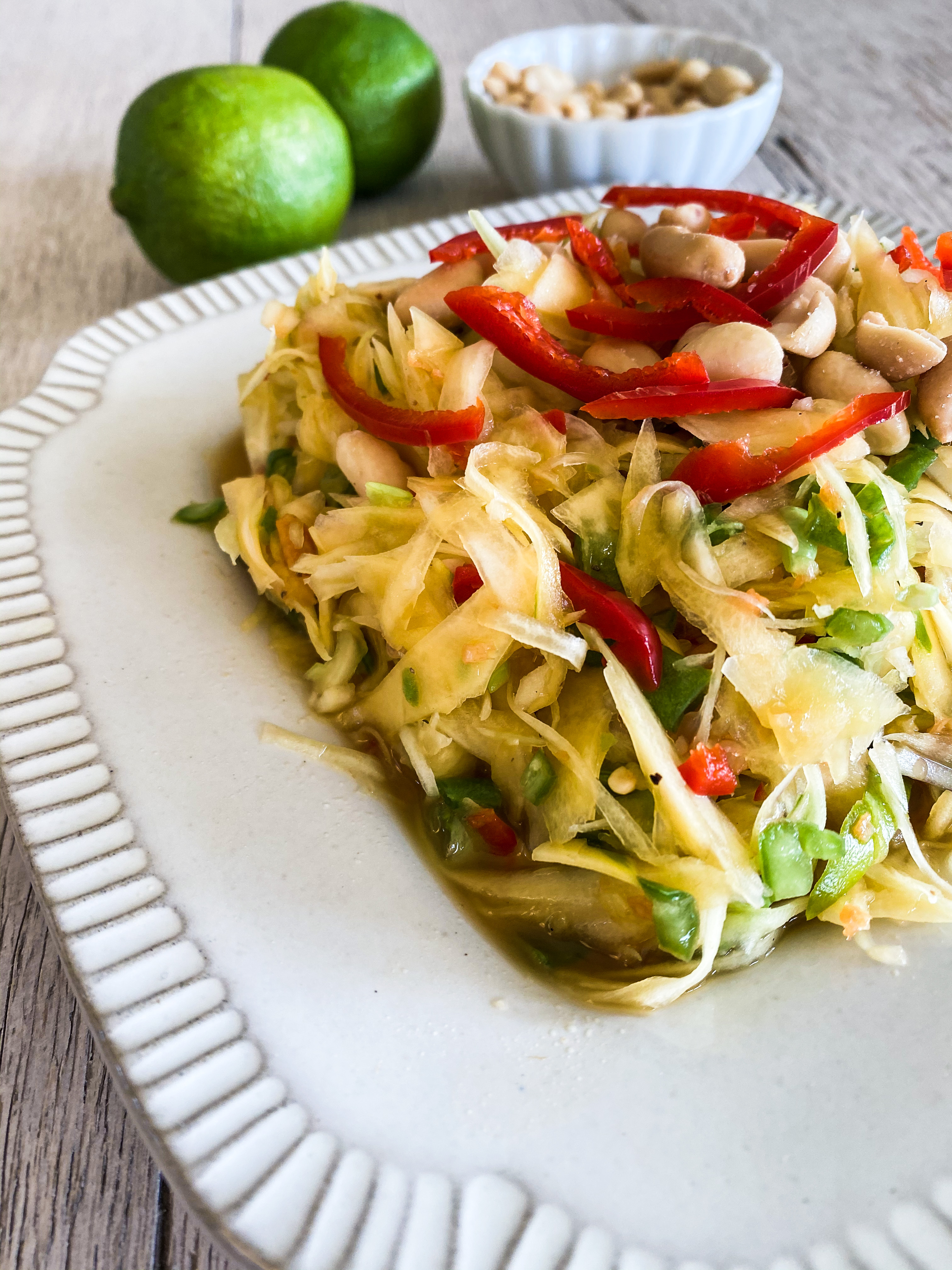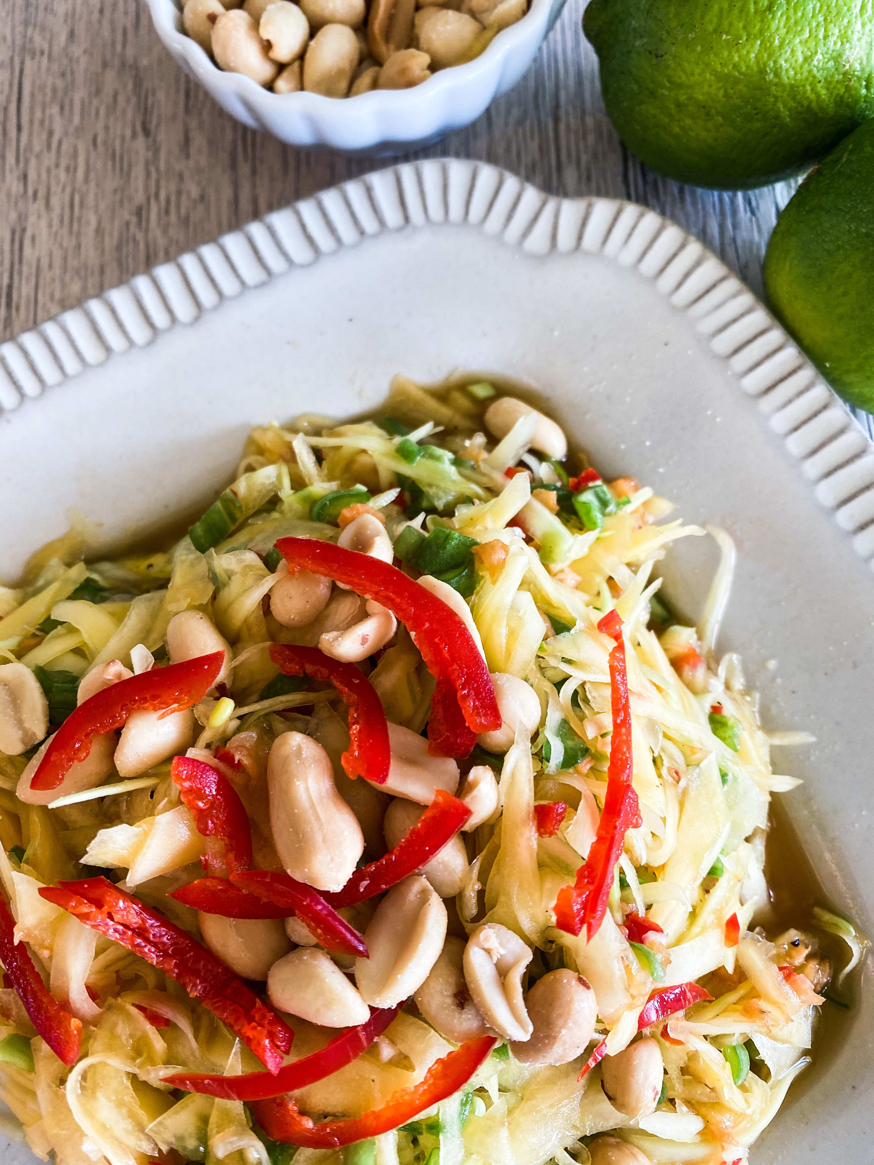 It’s super simple – shave unripe papayas, toss with a light, tangy dressing, top with salted peanuts and BAM you have a spicy, sweet, tart, tangy, clean, healthy, packed with nutrients, hearty dish to add to a rich meal.