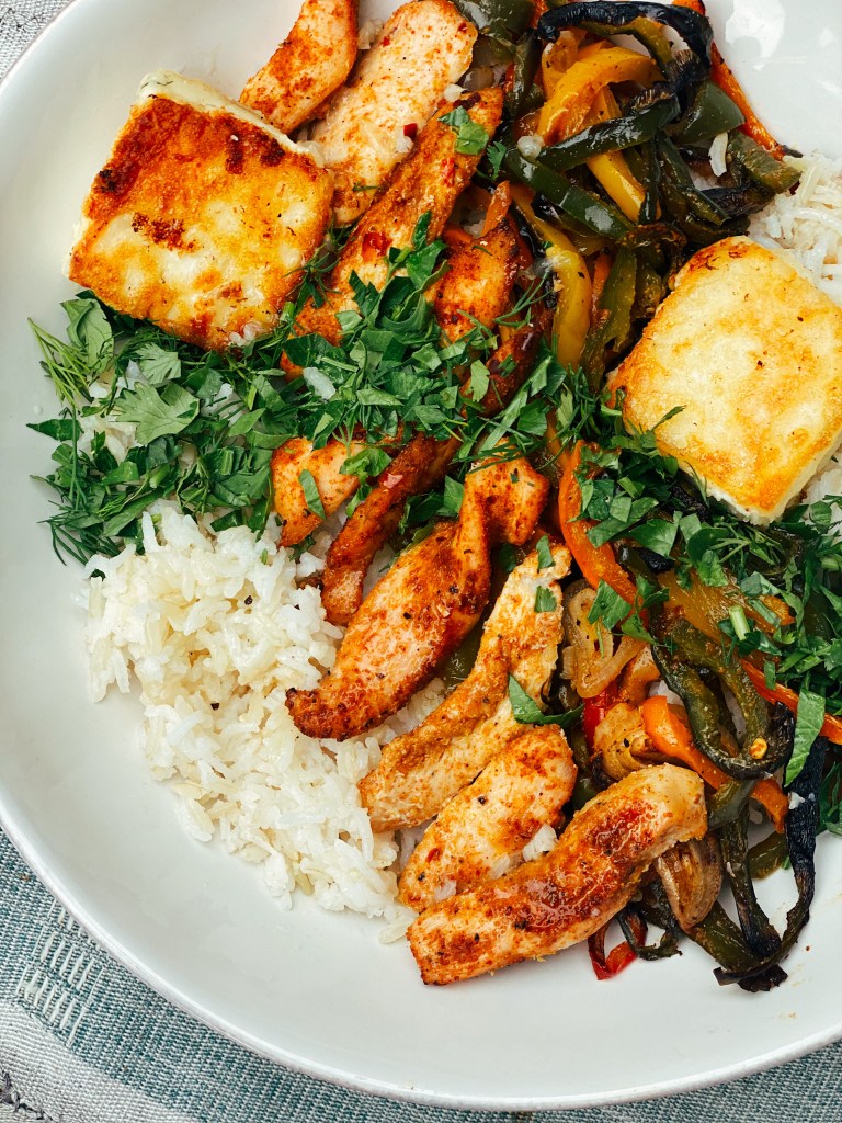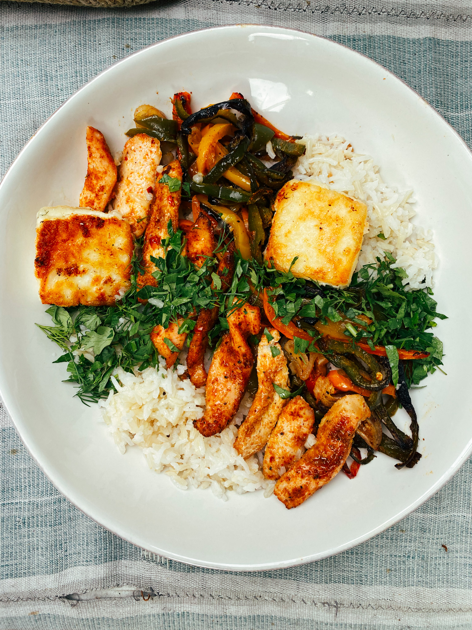The basis is there – rice, sheet pan seasoned chicken and peppers, crispy feta, an assortment of herbs, and an easy lemon champagne vinaigrette that I put on anything I possibly can.