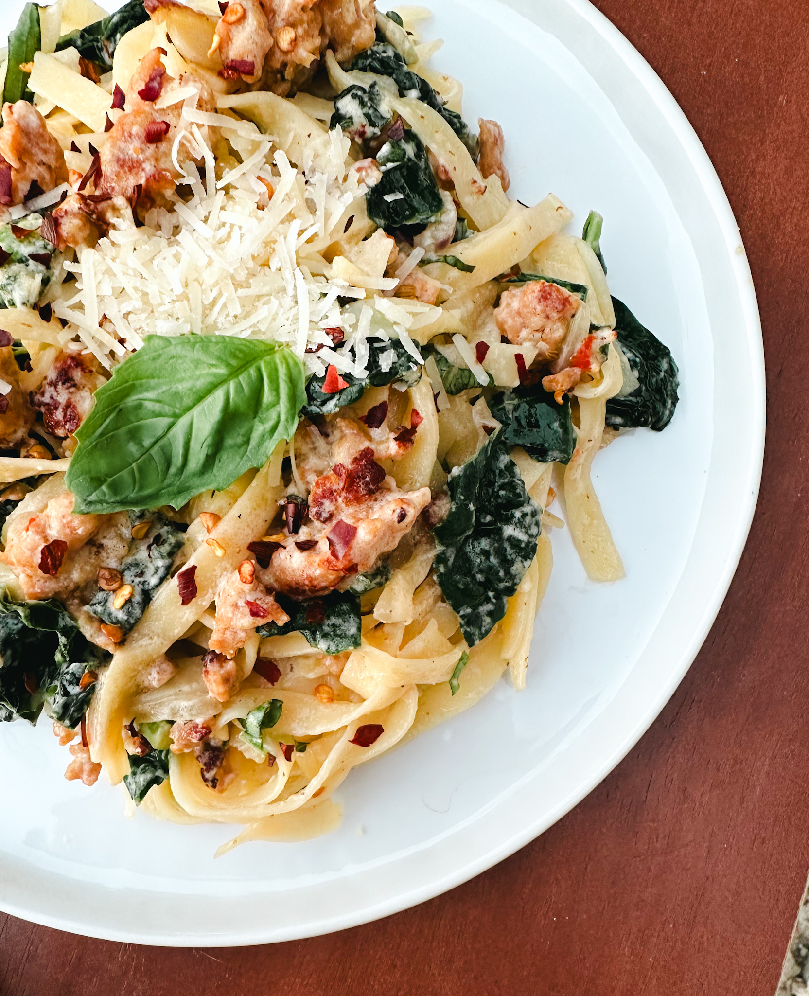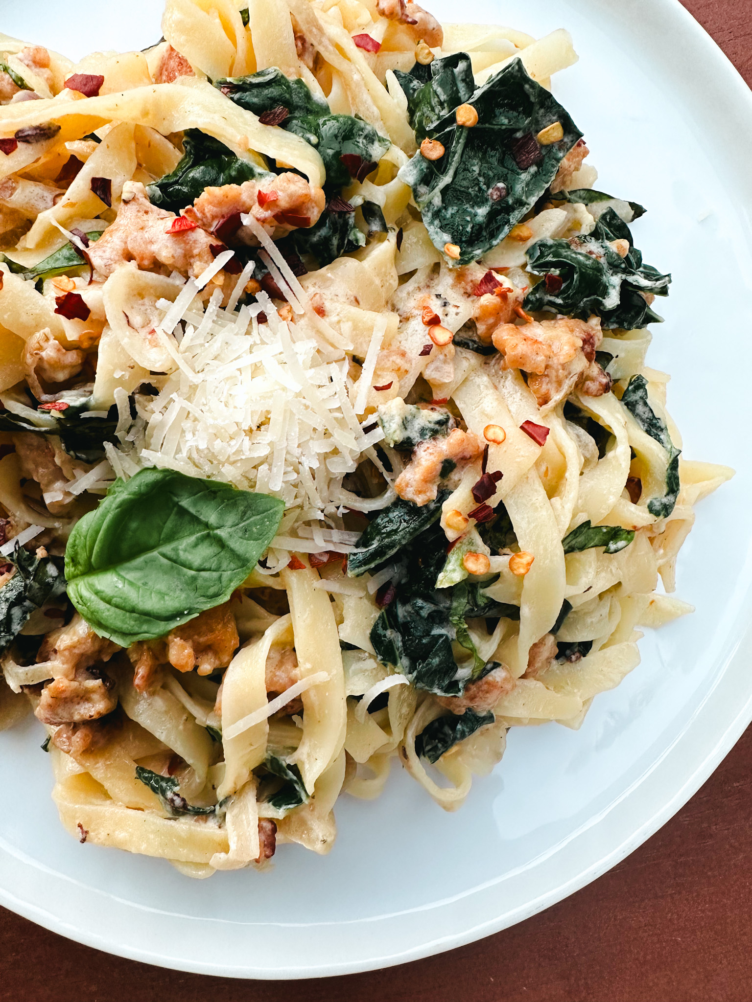 A few quick notes on the ingredients. 1) You can use any ground sausage you like really. Pork is delicious but for a midweek meal, I always go for the spicy chicken to keep it leaner. 2) I always have nonfat milk on hand so use that for ease but a milk with higher fat content will improve the texture of the light sauce as it mixes easier with the cheese. 3) You can use pre-shredded cheese but I highly recommend you shred it fresh. This is because packaged shredded cheese has added preservatives to make sure the cheese doesn’t stick together when sitting on the shelf for awhile. When you shred fresh, those preservatives aren’t present, making the cheese much easier to melt, blend, and mix with other ingredients. 4) Any long pasta will do but I highly recommend Trader Joe’s gluten free Tagliatelle. If you see it, grab it. It’s the first GF pasta that Nick has admitted tastes ‘normal.’ Let me preface that I balk at labeling gf pasta as tasting the same because most pasta tastes like the sauce you put on it, not the pasta itself, but the texture of this pasta is spot on. It’s not mushy, it doesn’t stick together, and feels oh so elegant.