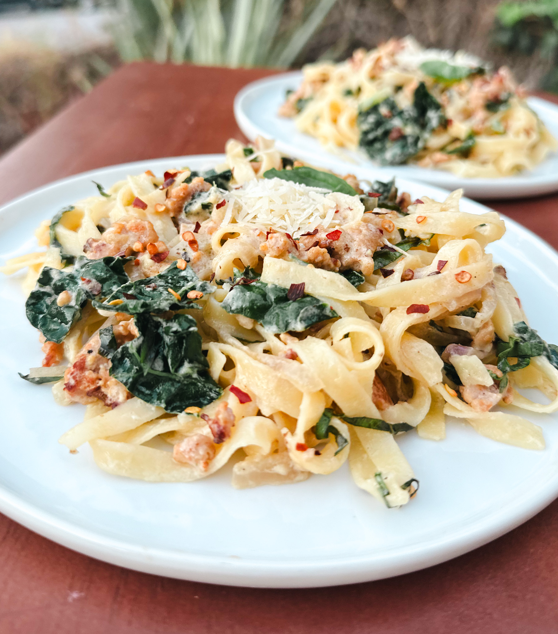 All that to say, for those of us who could do without the heavy pasta dishes – or are looking for a healthier option to satisfy a love of pasta – this ‘Lightly Creamy’ Sausage Kale Pasta is the real deal. It’s flavorful comfort food but will way less ingredients and at least one vegetable packed in.