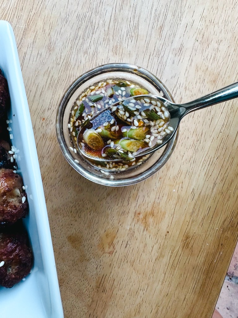 You can also air fry, bake, or pan fry the meatballs while simultaneously whisking together the Thai dipping sauce so it’s quick and easily accessible. I am an avid air fryer user so I usually go that route if it’s just Nick and I, but when making larger batches, it may be easier to bake since the surface area is larger. Having said that… make double or triple the recipe! Once you combine the ingredients, the longest cook time process is rolling the balls so it’s really no sweat of your back.