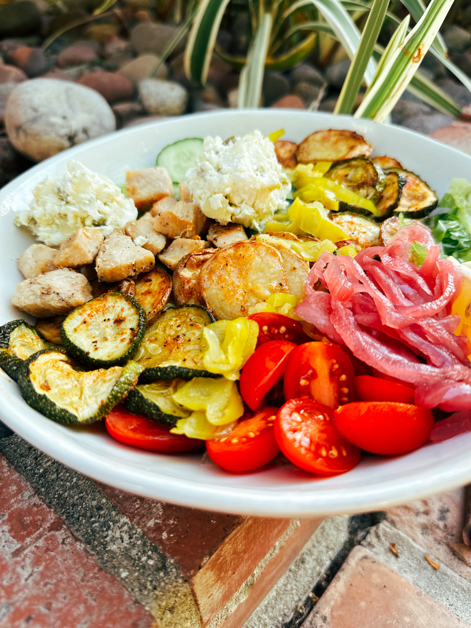 - Time to assemble the bowls: start with a big bed of chopped romaine, then pile on the roasted potatoes, zucchini, cucumber, tomatoes, pepperoncinis, and top with a large dollop of feta dip and hummus.