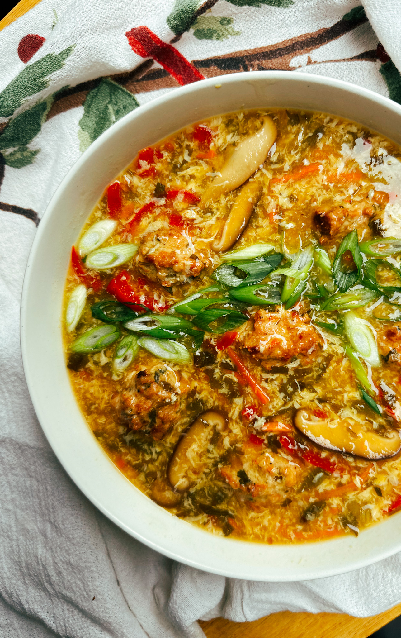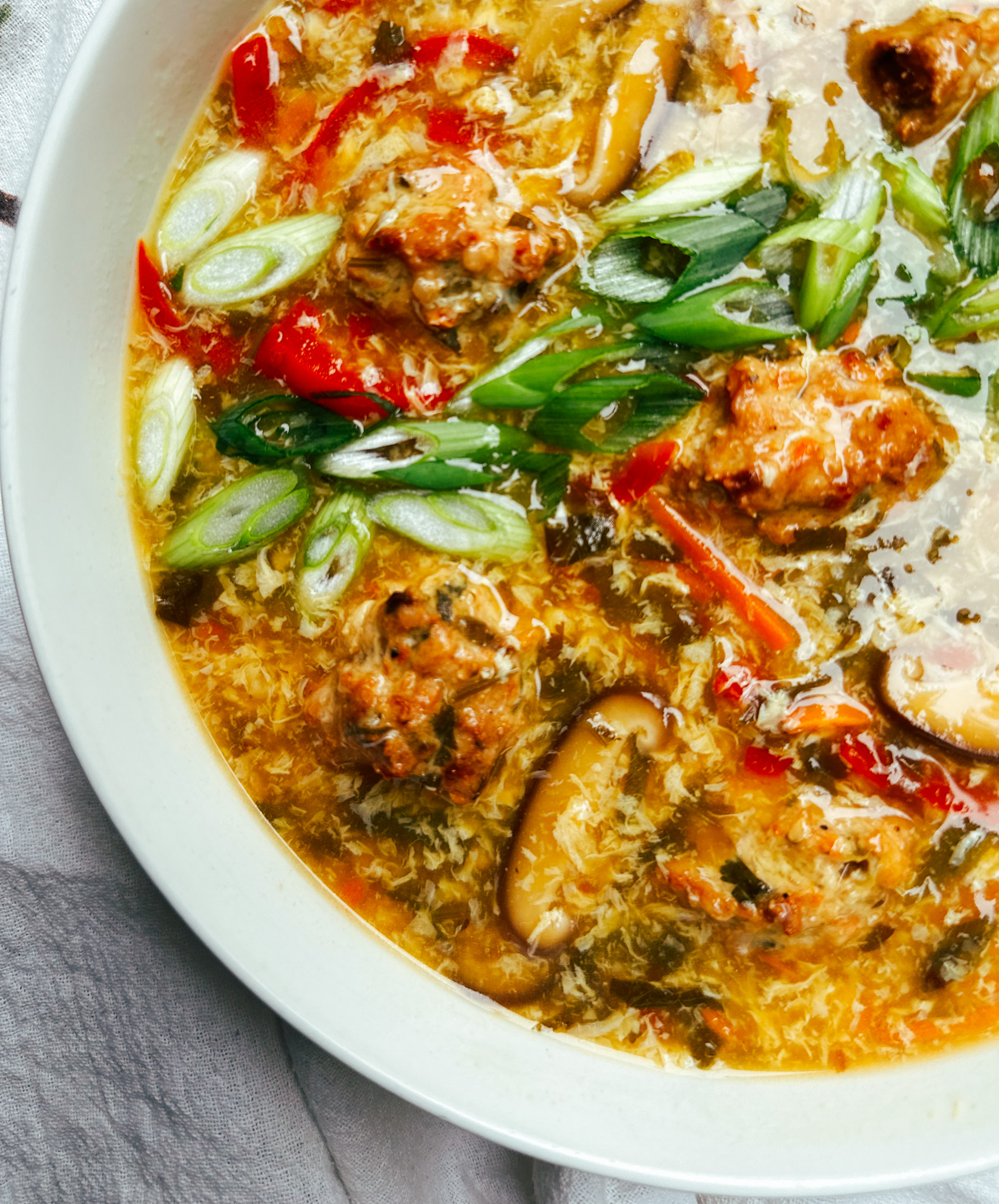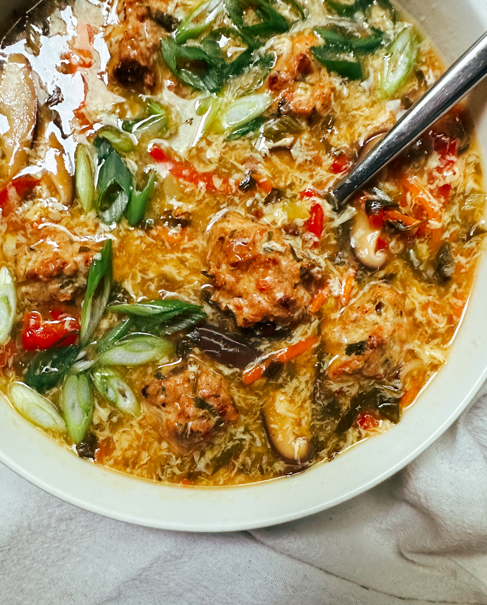 This version came from a desire to incorporate more protein into meals. I would always accompany the Hot & Sour Soup with a side of chicken larb or skewers but was tired of feeling like I was making two meals for the price of one. Then I remembered how much I love a good meatball soup. Why not add the meatballs in to the soup, upping the protein and making it hearty enough to not need additional dishes? Genius if I saw so myself! While I was at it, I might as well add more vegetables in there.