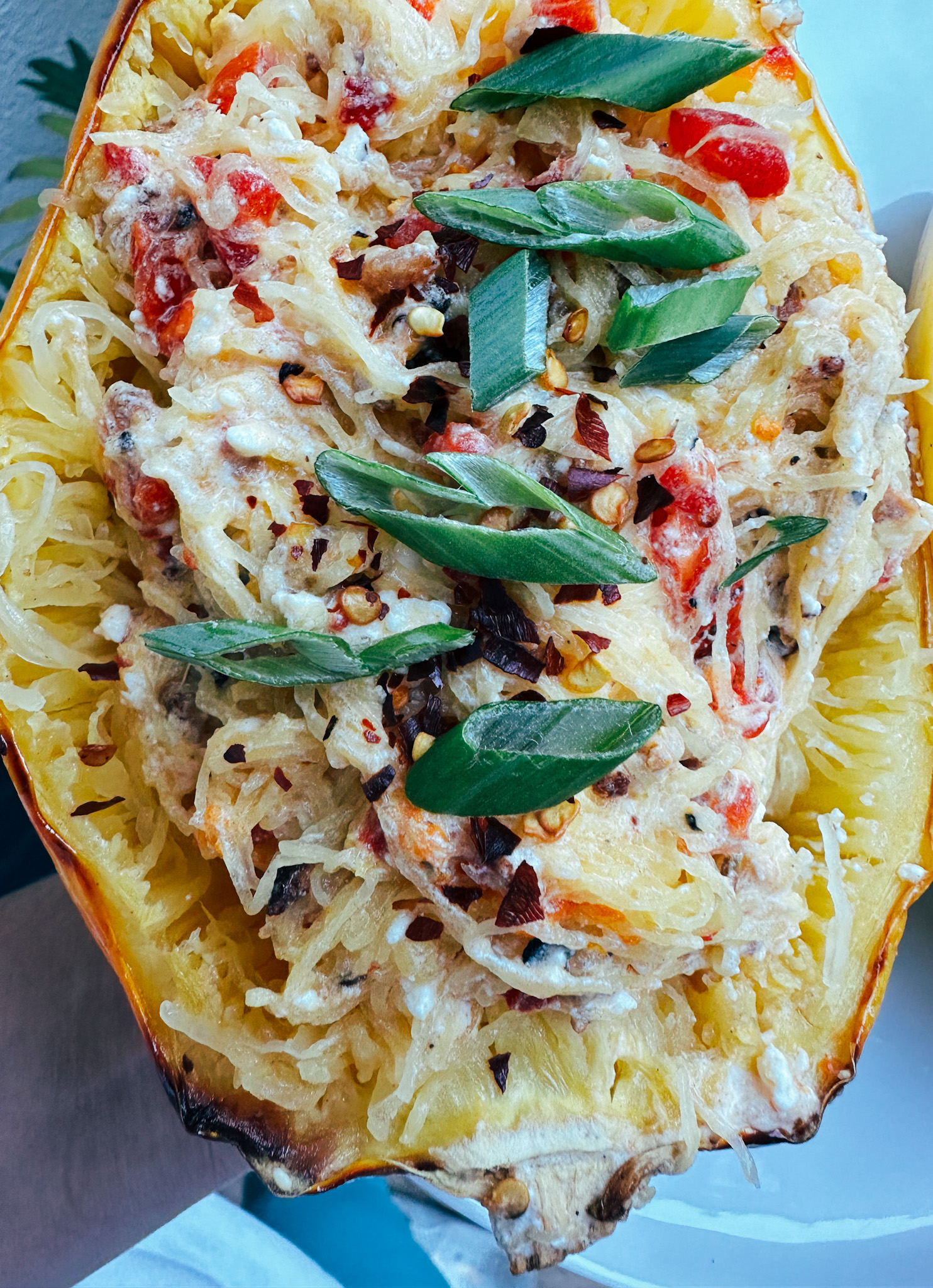 Sometimes I am inspired to make elaborate meals. Other times I could care less. Enter my Baked Spaghetti Squash Boat-era. If you are on social media you may remember the viral feta and tomato dip trend where you simply bake feta with tomatoes, garlic and olive oil then mix together and add to pasta. Well this had me thinking, could you skip the separate step of making pasta on the side to stir in and simply bake it altogether?