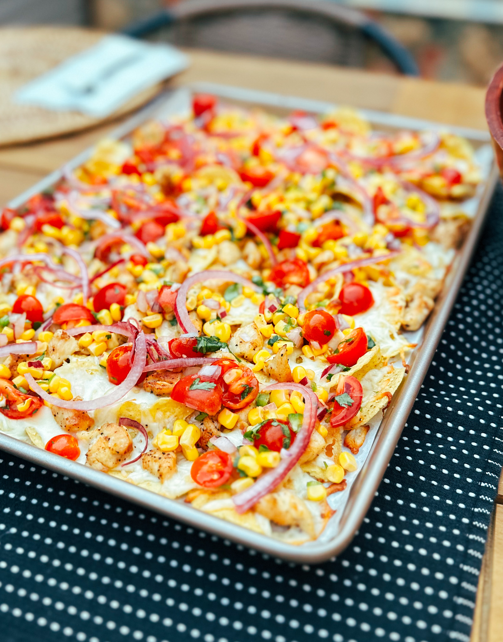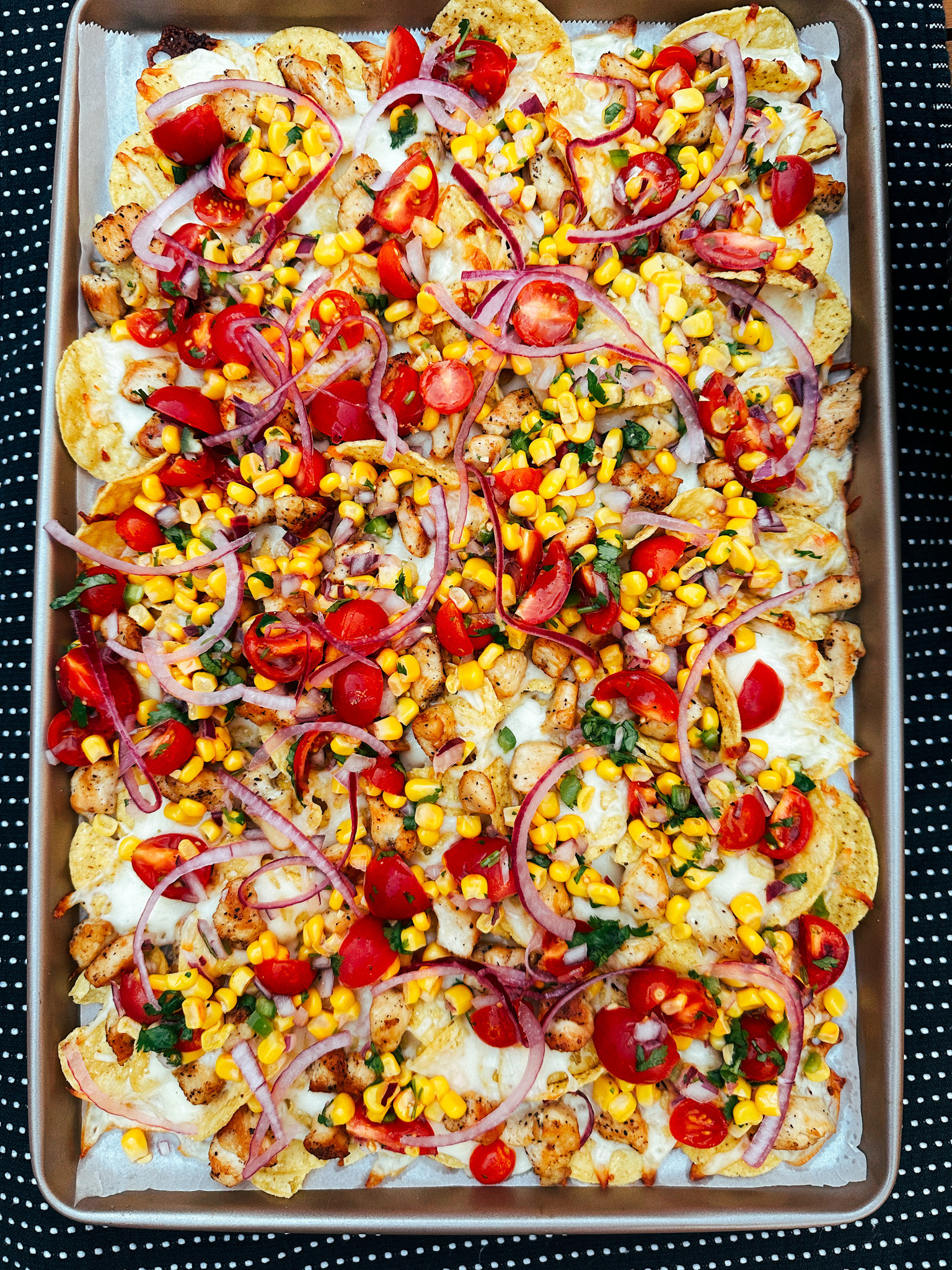 On 4th of July weekend, my friend Lauren made an epic nacho spread. I can’t even remember all the ingredients she used at this point but the notion of summertime inspired nachos stuck with me. As someone who has spent many a drunk late night in college gobbling down hole-in-the-wall nachos listening to Nickelback (not my choice… you’d have to ask the DJ at said NYC late-night joint), nachos are comfort at it’s best! But Lauren’s nachos were not topped with squeezy cheese and way too many canned jalapenos like the old days. No, this was a bonafide side dish complete with vegetables, protein, and yes… lots of REAL cheese.