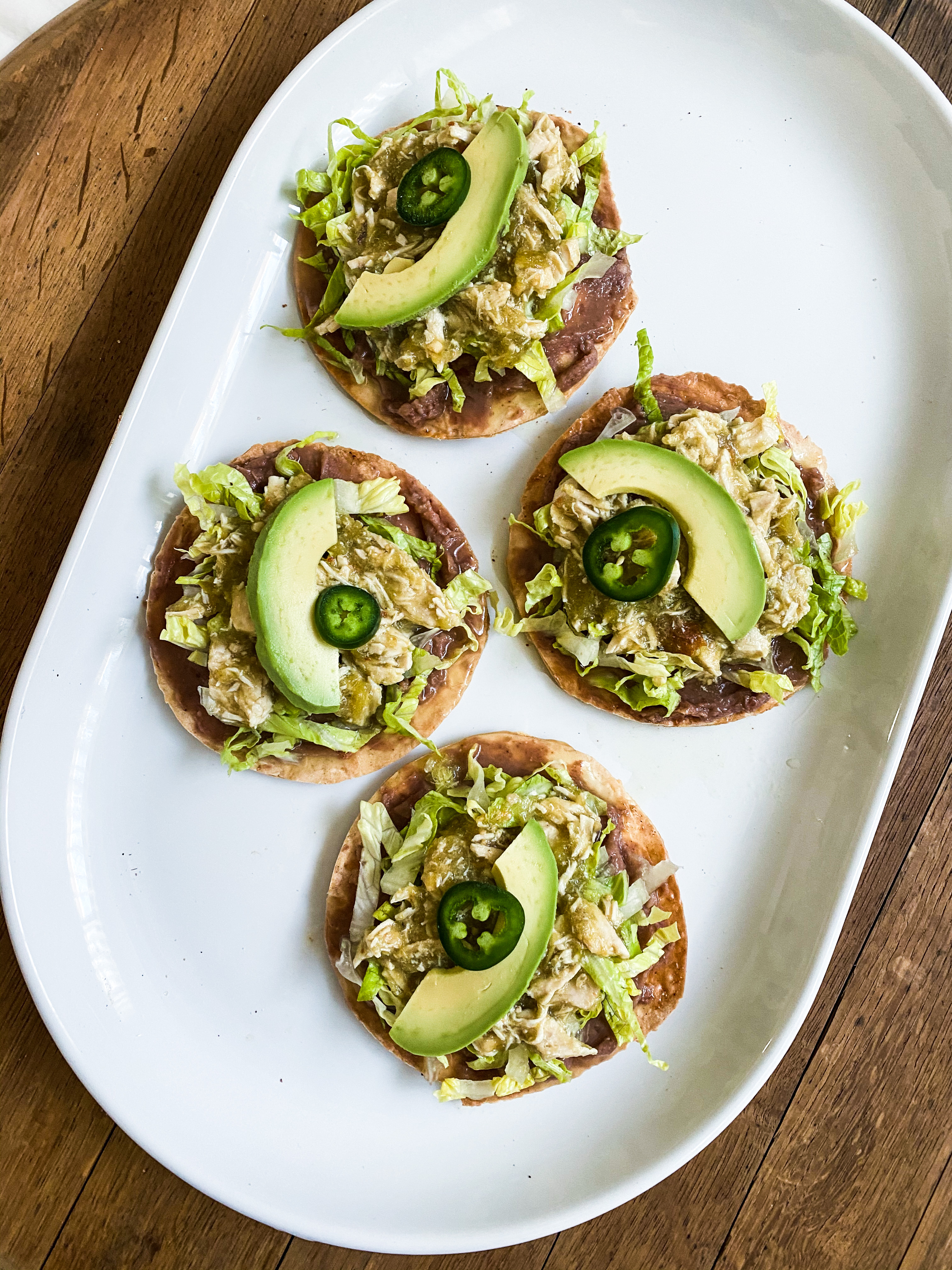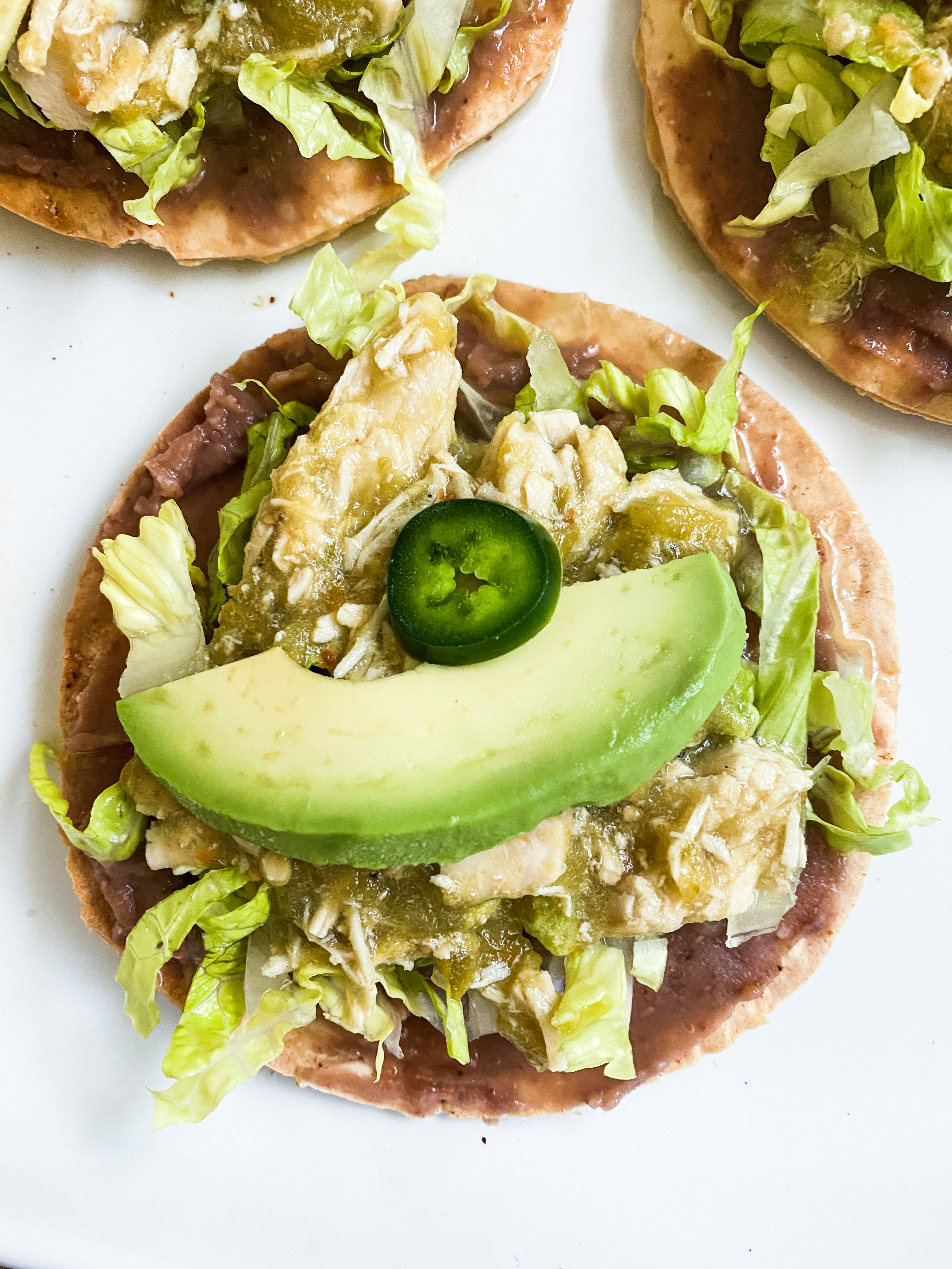Before heading off to college my mom taught me a few signature no-fuss meals. One of them being crockpot tacos. Simply throw a jar of salsa and some chicken breast in a crockpot in the morning, then shred it in the evening for tacos. Genius! The only problem is, I love a good crunch in my meals and tacos can get soggy fast. Enter: tostadas. An easy fix to the crunch problem. You can pile the shredded crockpot chicken on top with goodies like romaine, avocado, beans, cheese, hot sauce, cilantro, you name it. The more toppings the better but I kept it simple here with shredded romaine, black beans (from a can, yes), avocado, and jalapeno.