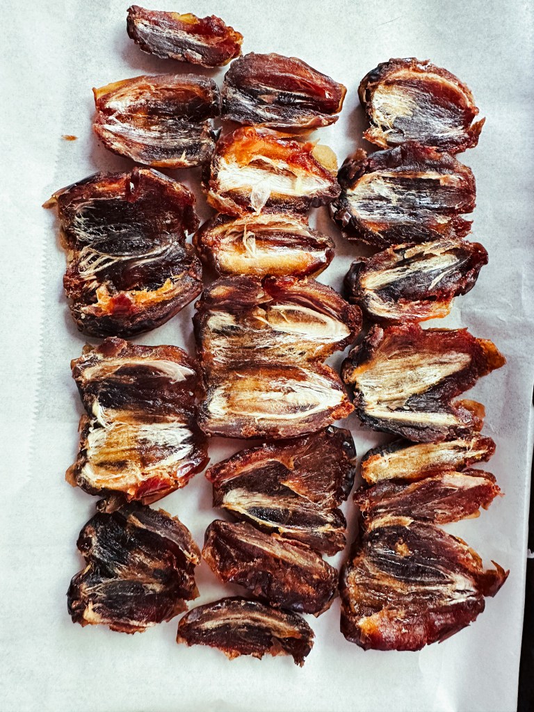 • Gently open the dates and lay on the parchment paper, pressing until flat. Line each date next to each other so they are touching into an even layer on the baking sheet (there still may be spaces in between, that’s okay, just minimize).
