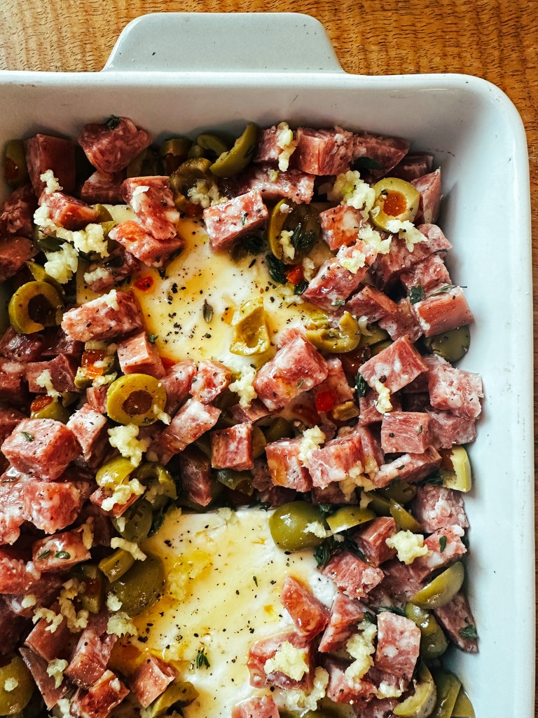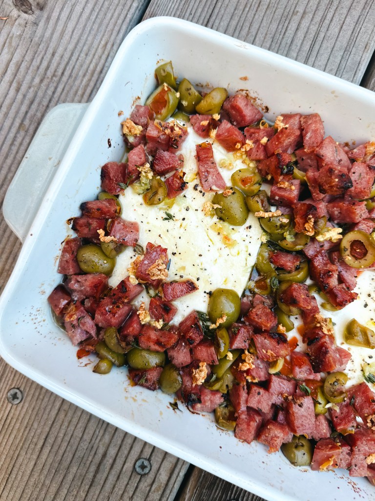 This recipe is super simple and not the most photogenic but trust me, it’s a fan favorite. And although it does require some bake time, it is quick enough that it doesn’t impede on the major dishes if hosting a dinner after appetizers. If you are just doing pupus, then this is an added hot dish to the offerings that is addictingly good. It’s oh so salty with the soppressata and olives, while the feta creams everything together into the perfect dip. Even if you don’t like olives standalone, I think this could be up your alley.