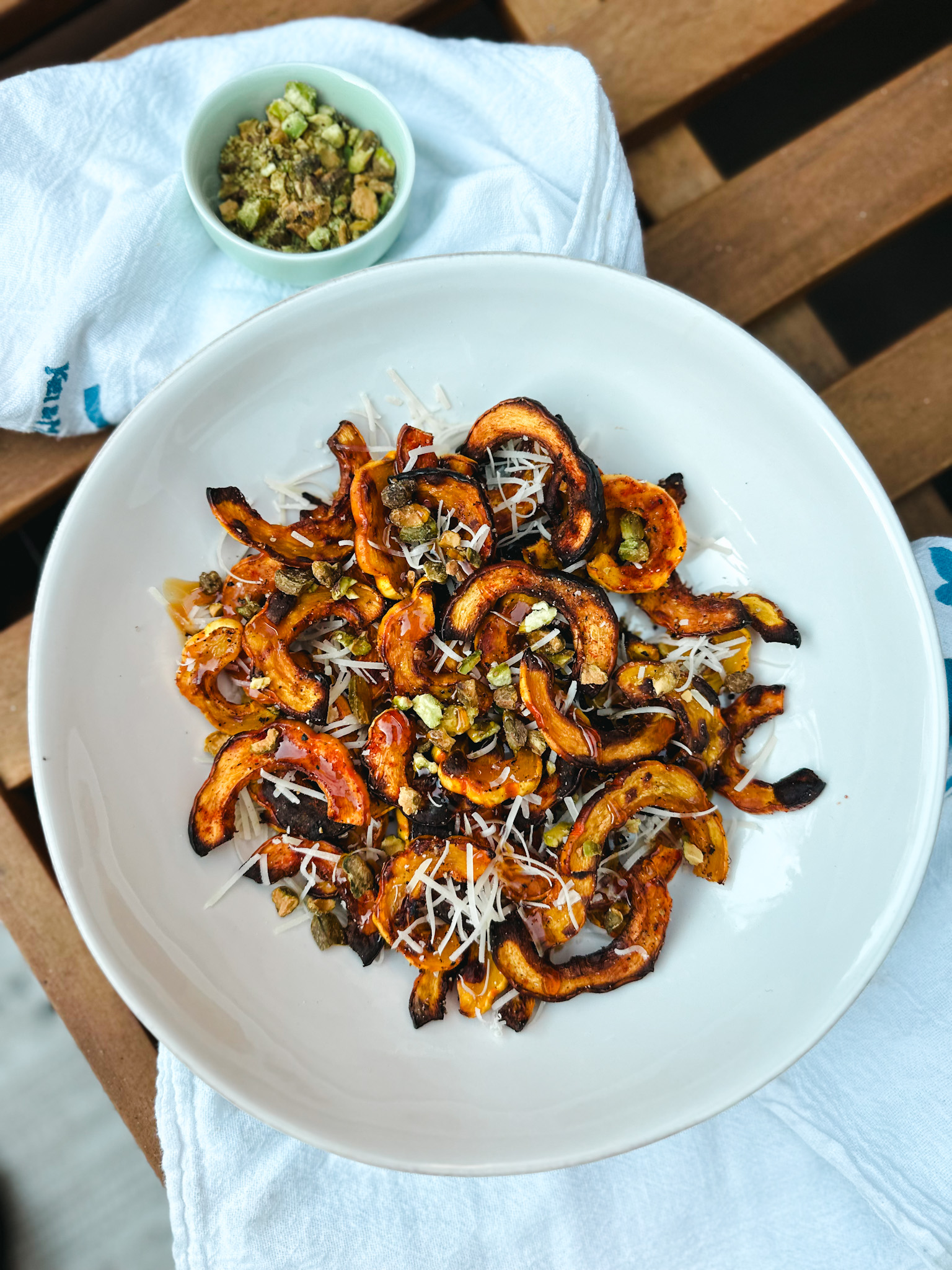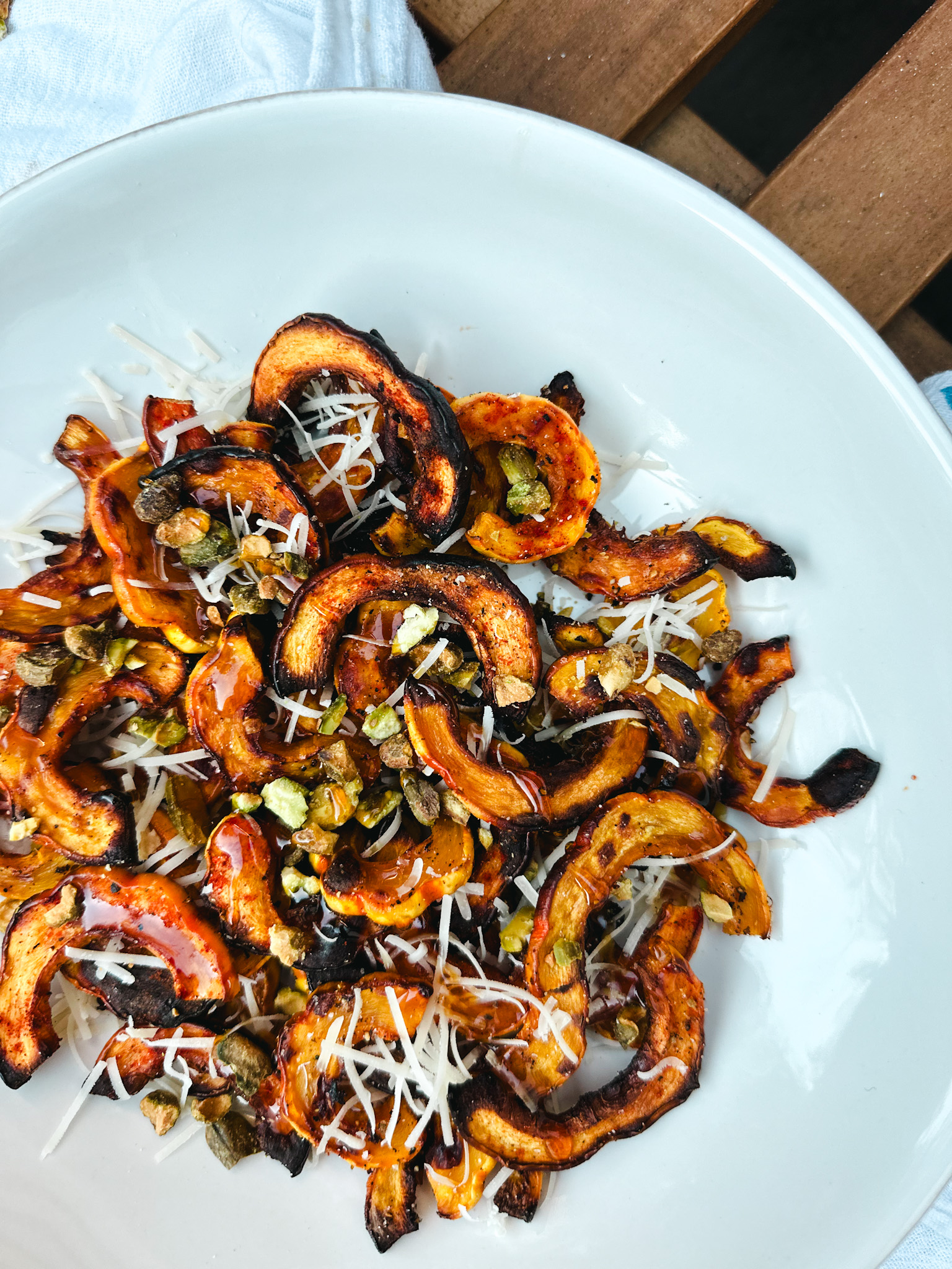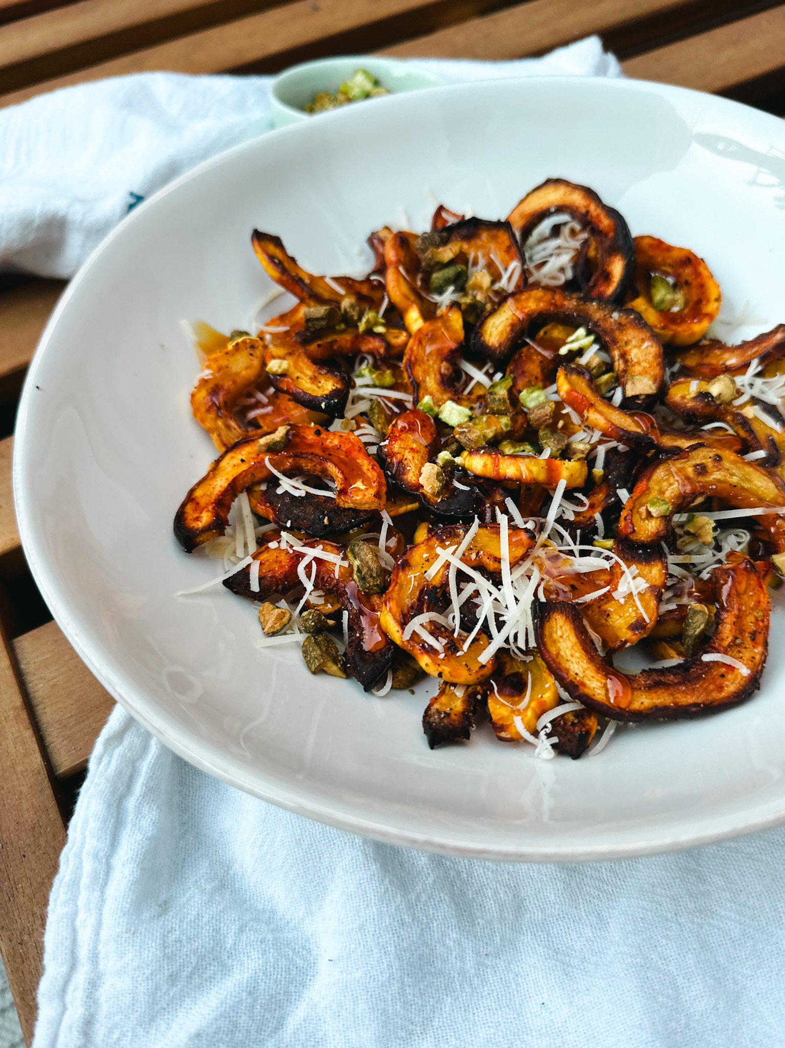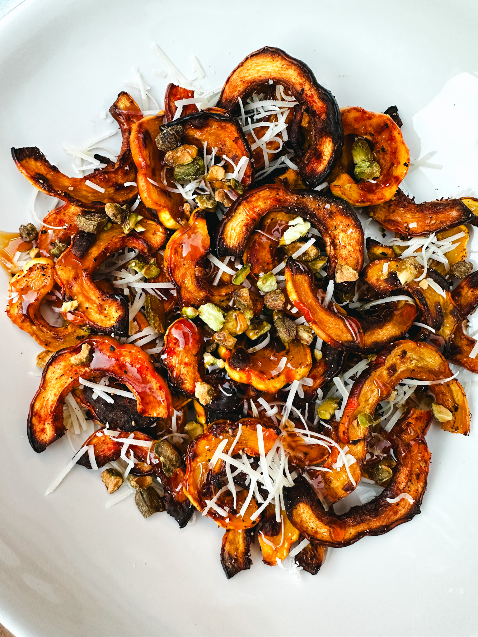 Recently that sophisticated side dish for me has included parmesan, pistachios, and hot honey. Anything with hot honey is delicious. But this flavor combination is incredible. It’s so simple and yet adds so much depth. It’s like you are making a $12 steak house side but with stuff you already have in the pantry. Perfect!