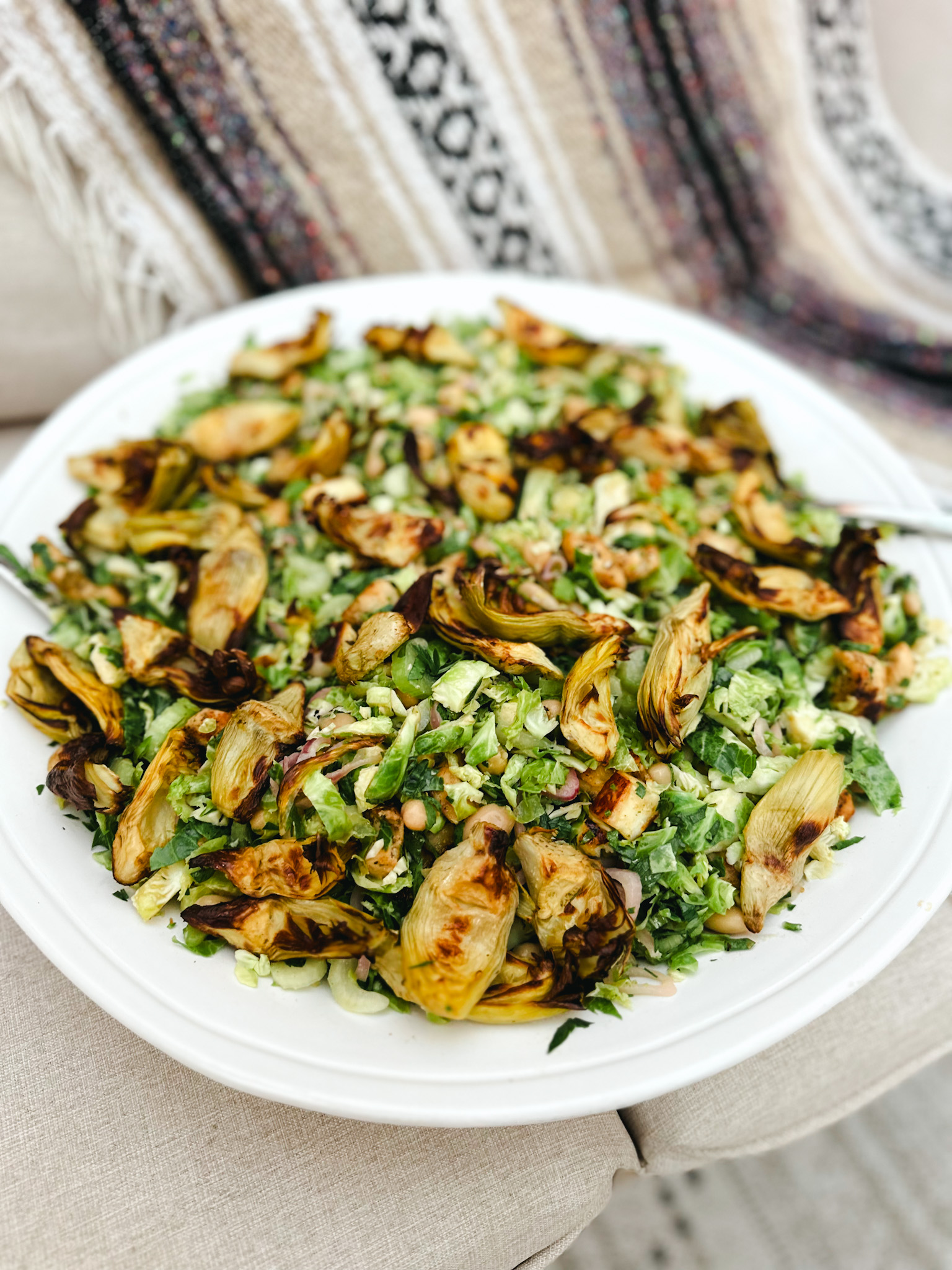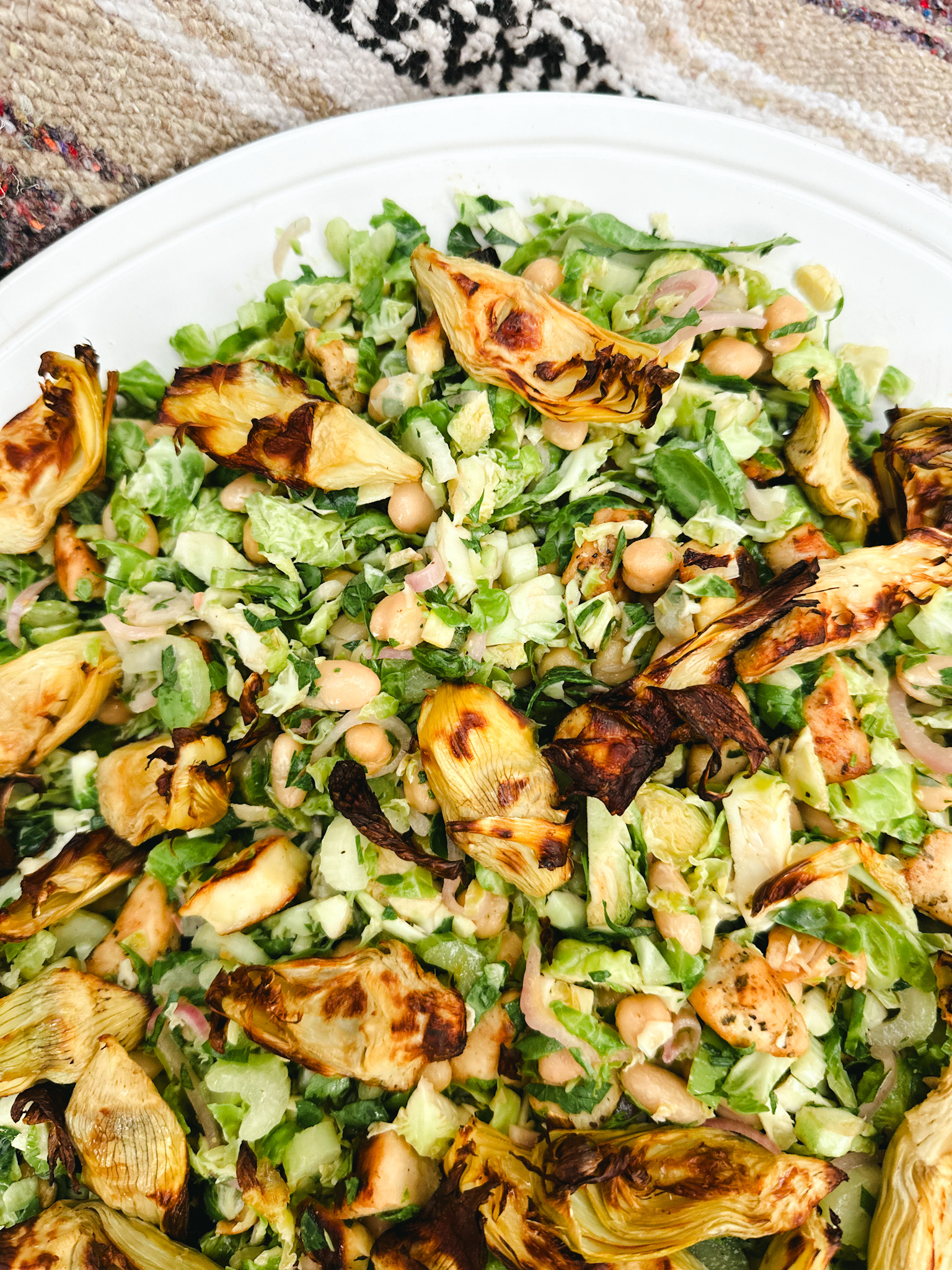This is one of those salads. I come back to it when I am yearning for something a bit different, knowing I will be so pleased when I am sitting down to a big bowl of it for dinner (or lunch). Filled with hot honey-drizzled halloumi (I mean – warm cheese – cmon!), chicken, crispy artichokes, beans, and crunchy celery… it hits all the right notes with flavor and texture.