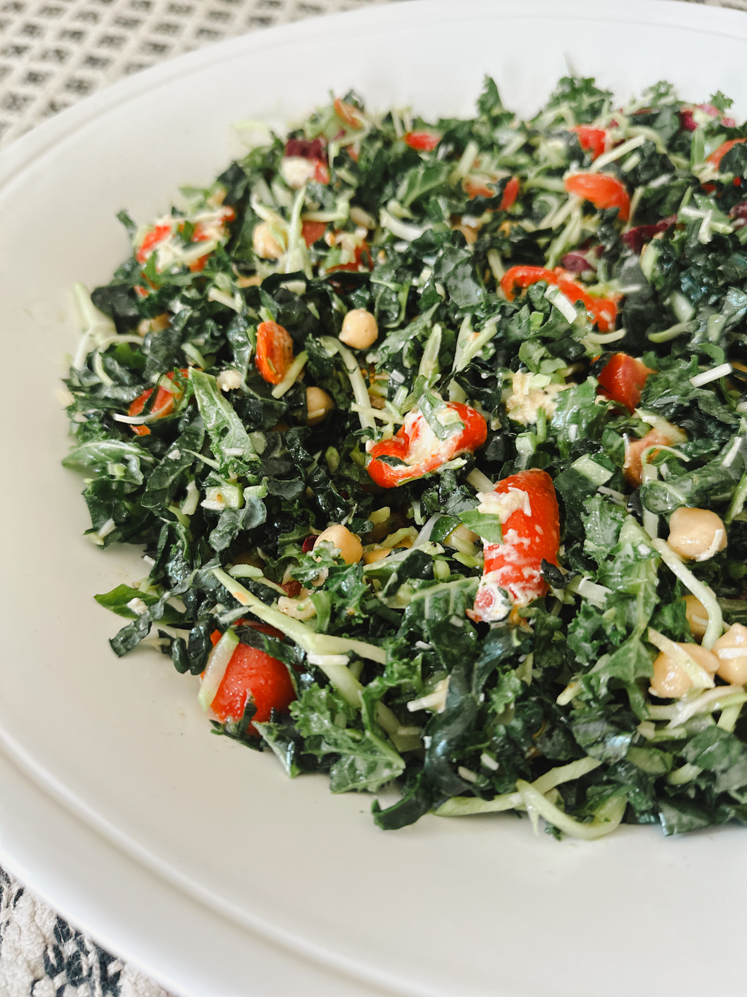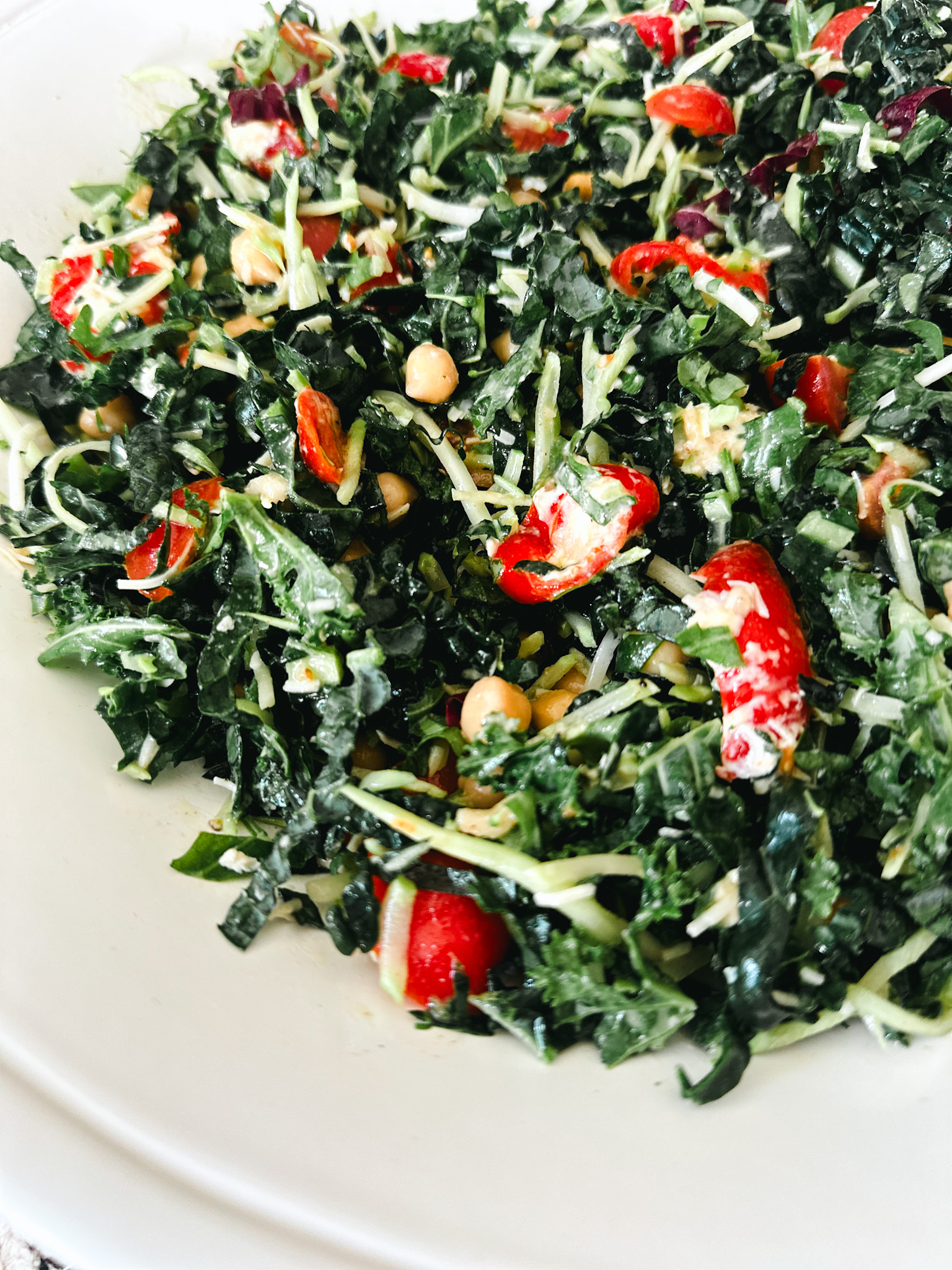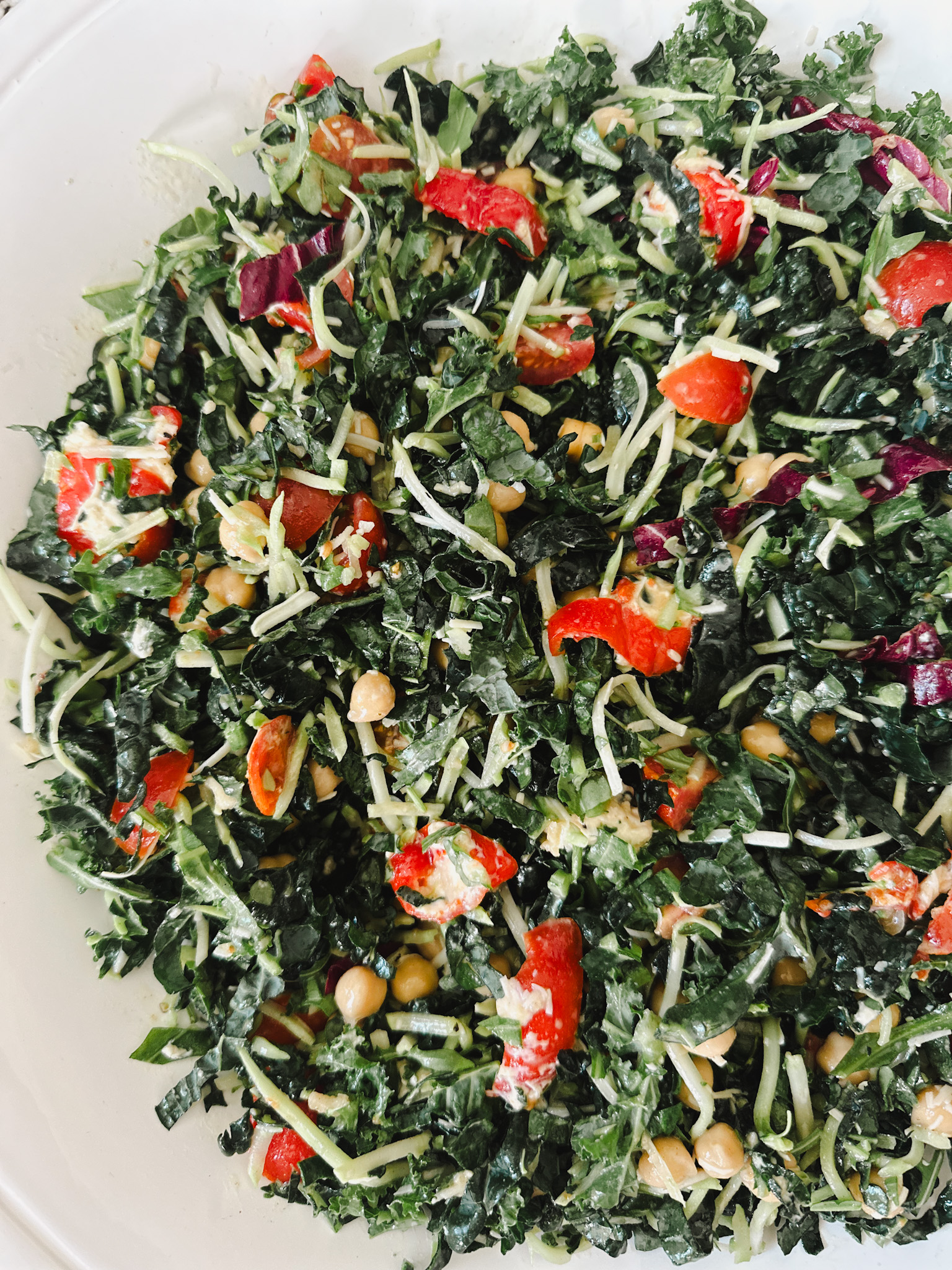 - Gently mix together chopped kale, broccoli slaw, chickpeas, peppers, and tomatoes.