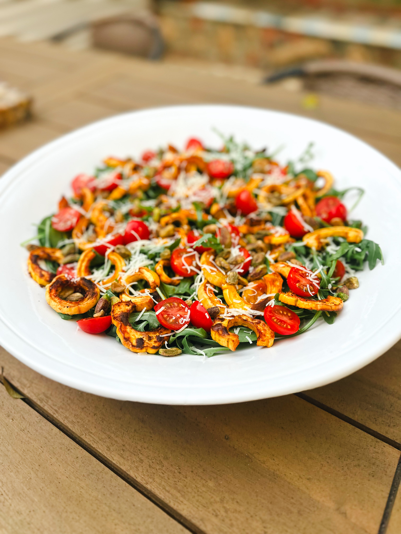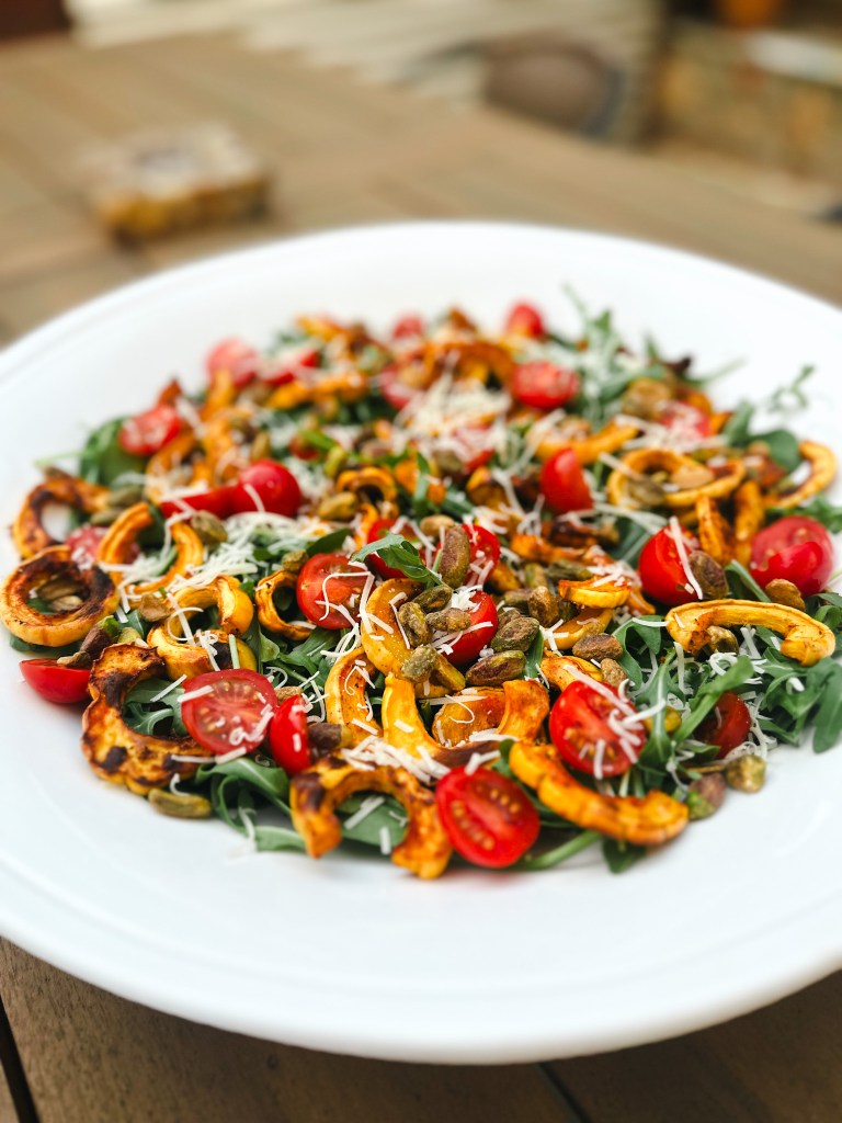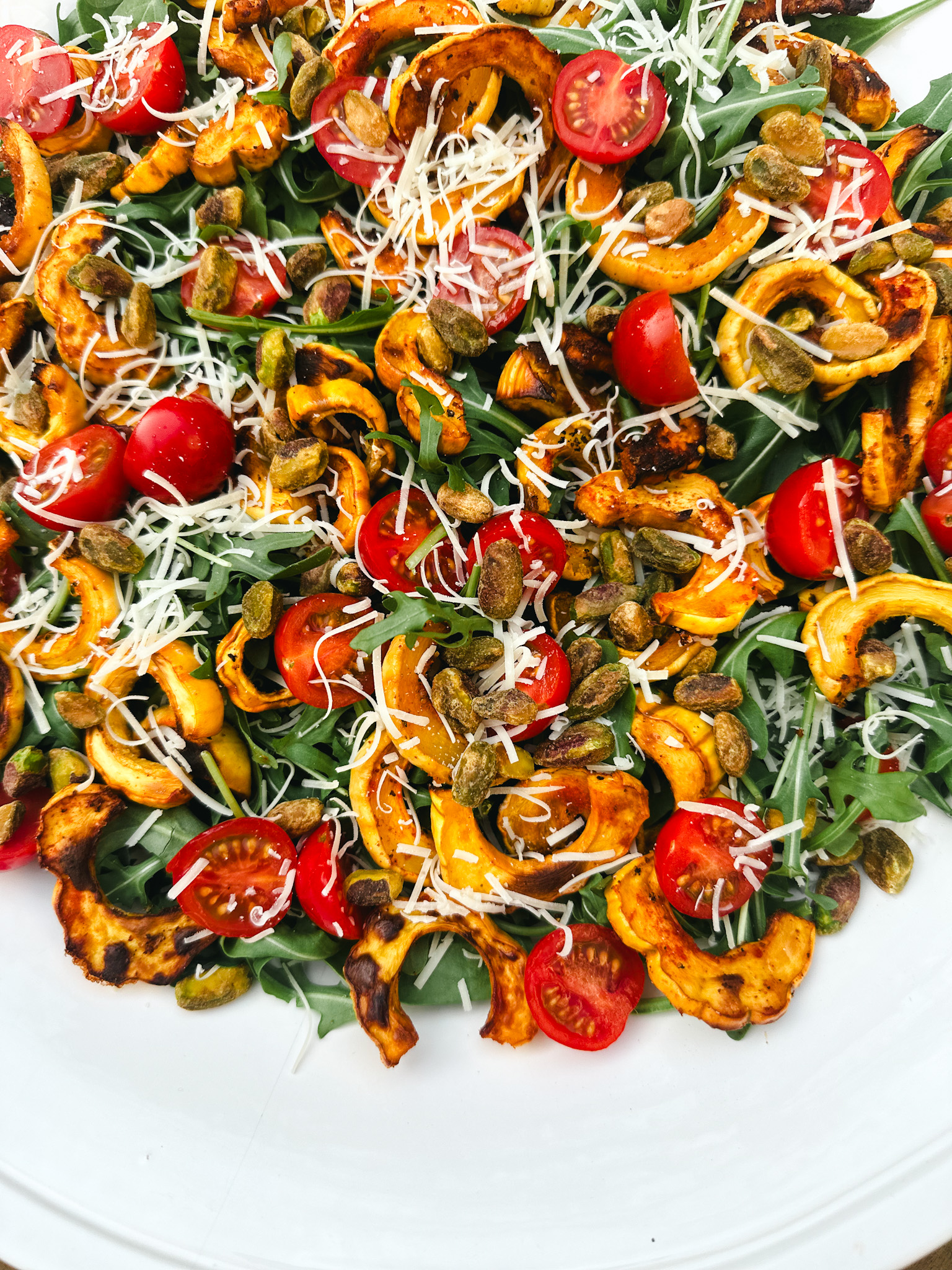Now this recipe is broken into 3 parts but that’s simply to be user friendly. When I am following a recipe, I want it to all be in one place and don’t particularly like clicking to multiple web pages just for one meal so I listed all the parts out here. But it’s honestly super simple so don’t be fooled by the length. You simply bake the squash and toss the salad ingredients together (baked squash, arugula, tomatoes, pistachios, parmesan, and dressing).