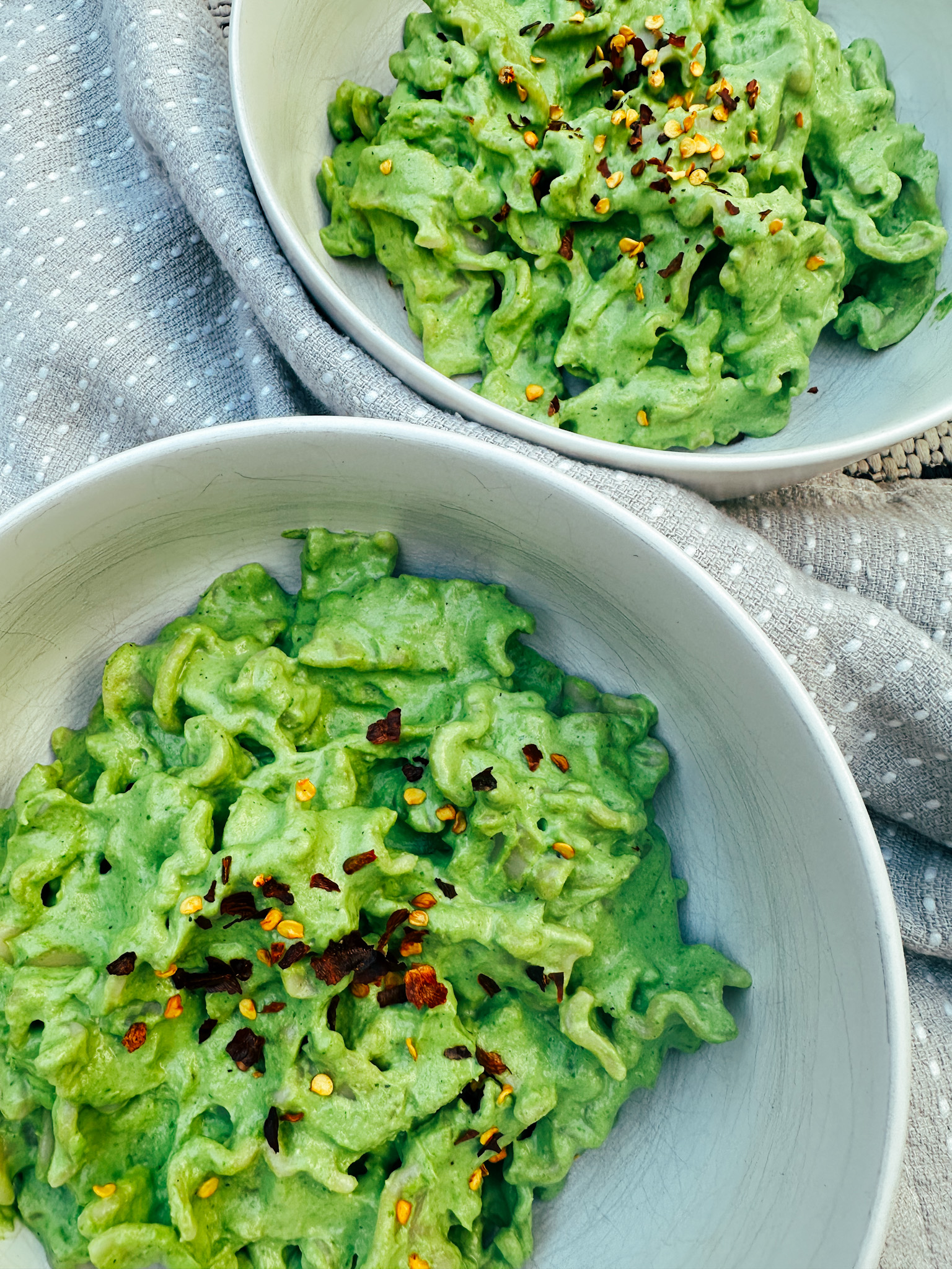 As a breastfeeding mama and woman who enjoys working out, I am always looking for ways to add protein into my meals to support my active lifestyle. This recipe simple but shockingly stacked protein heavy pasta dish came from none other than Kendall Toole, previously of Peloton, now fitness influencer(?) and I was initially flabbergasted by the recipe. How could tofu, spinach, and cashews taste good as a pasta sauce? Well I am here to tell you it’s awesome. So awesome I have been making batches for myself as another go-to grab-able snack in the fridge. Who doesn’t love guilt-free pasta as a snack? And this is coming from someone who famously doesn’t love pasta!