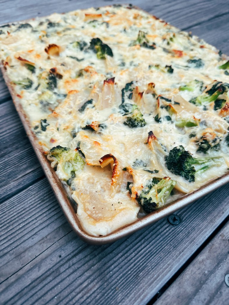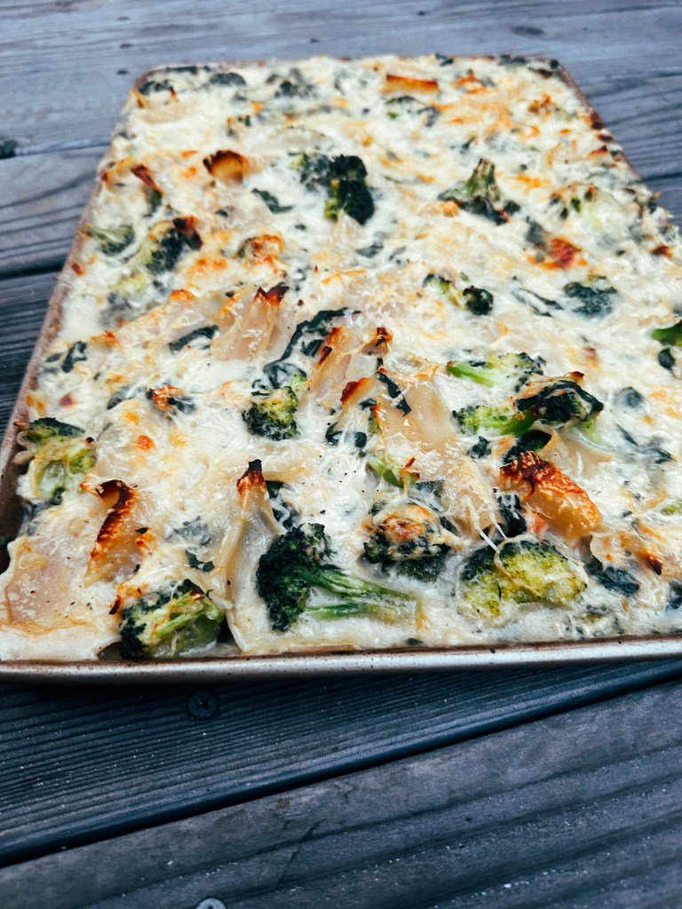 So today I am sharing a pasta-based sheet pan casserole that has all the ingredients we love! Cheese, chicken, broccoli… and spinach in this one! It’s healthy if there are two vegetables in it right? Probably not with the butter and milk. So we will call this a special occasion dish. Though I have made it a few times now for no reason at all.