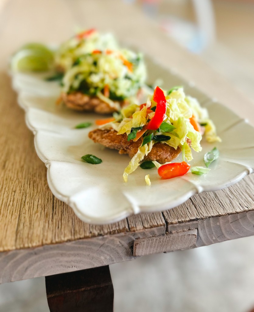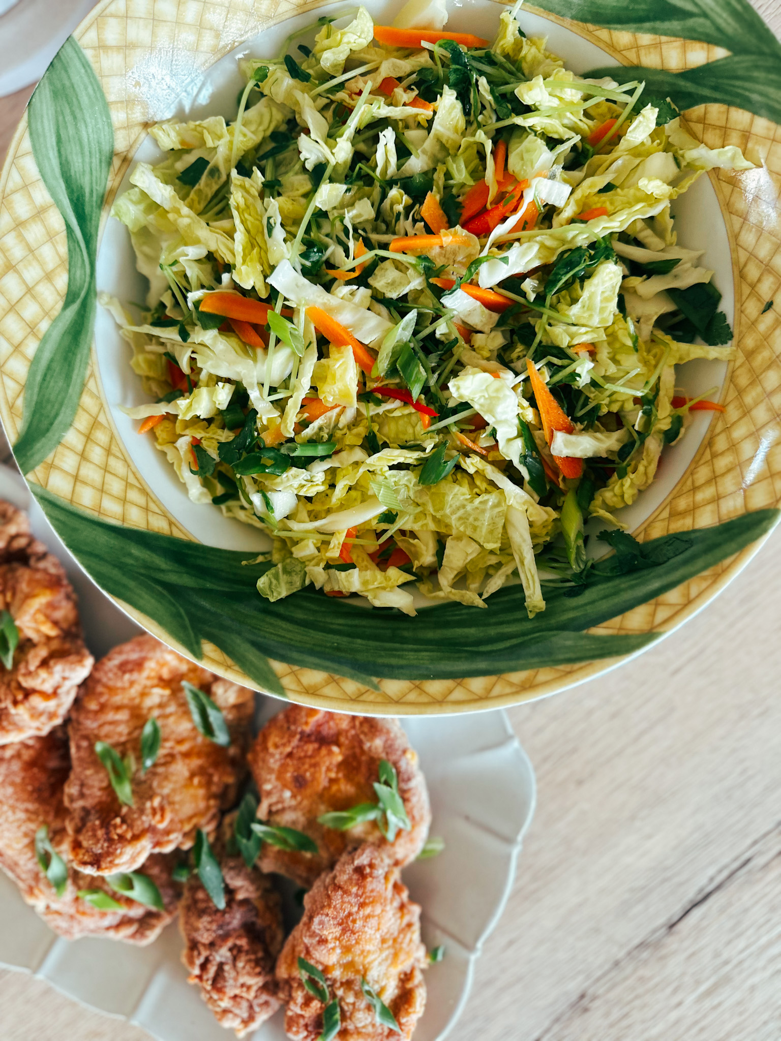 What do you pair this with? Glad you asked! To balance out a fried dish, I like to pair it with a big batch of asian cabbage slaw. Simple, clean ingredients that you can toss together quickly and counter balance the saltiness of the chicken with a mellow-er bed of green.
