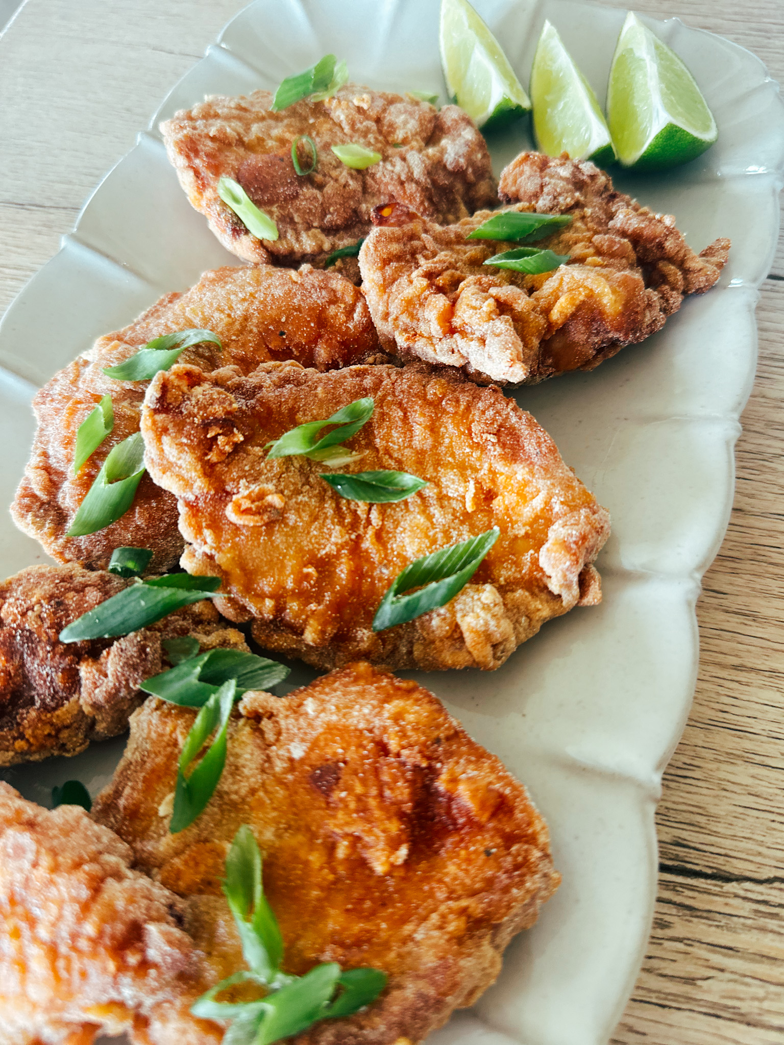 Additionally: ½ cup mochiko flour and 1 cup oil for frying