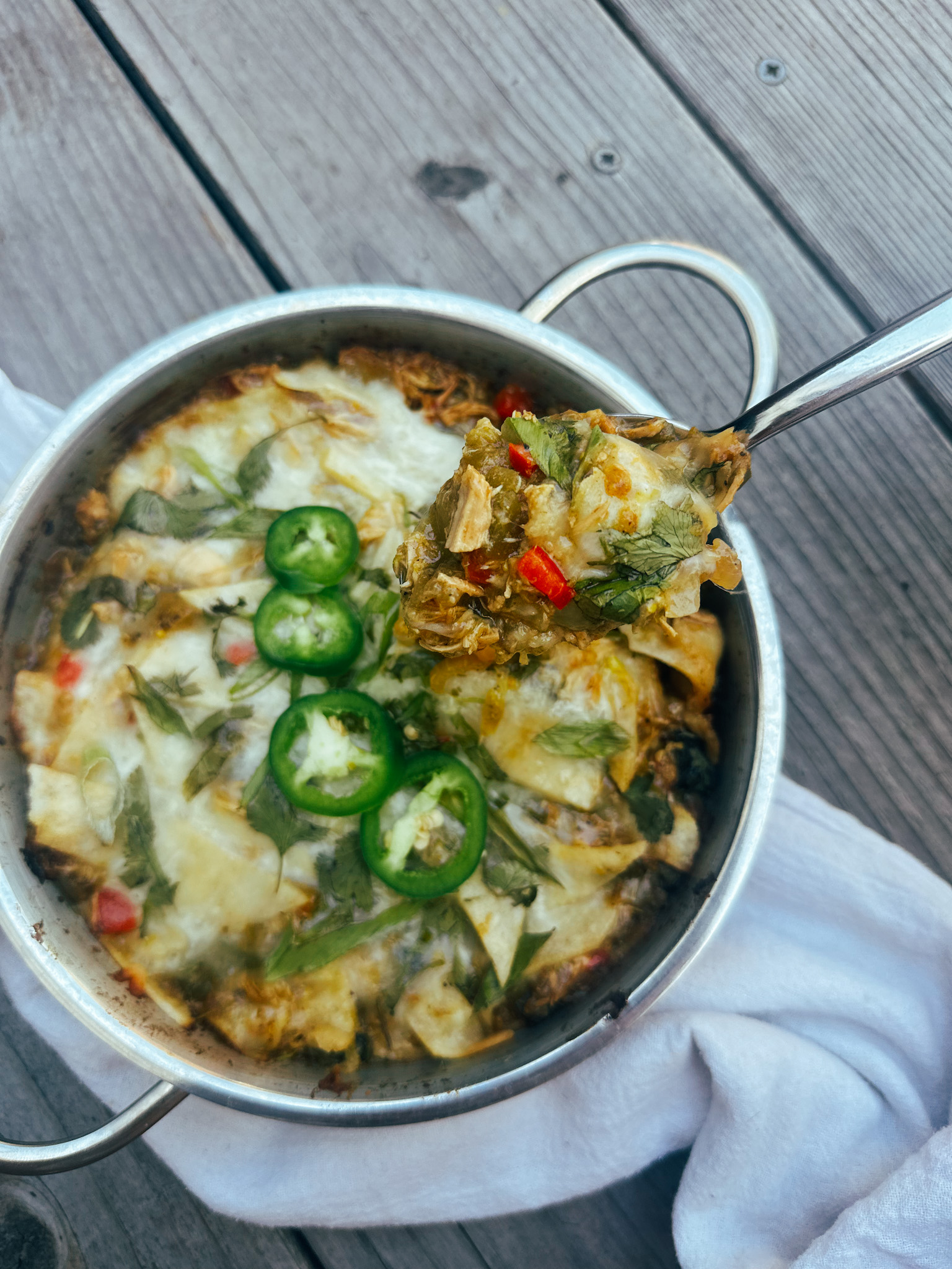 So this week I bring you a one-pan enchilada-inspired skillet that is packed with vegetables and protein AND takes less than 30 minutes. It’s a rendition of one of my favorite wellness and fitness influencers Rachaels Good Eats one-pan skillet but streamlined and simplified to perfection. You can start with shredded rotisserie chicken or quickly make your own by boiling chicken breast and shredding with a fork and knife. Then stir in roughly diced veggies, cover it all in salsa verde AND enchilada sauce, then throw it in the oven for a delicious bubbly cheese topping.