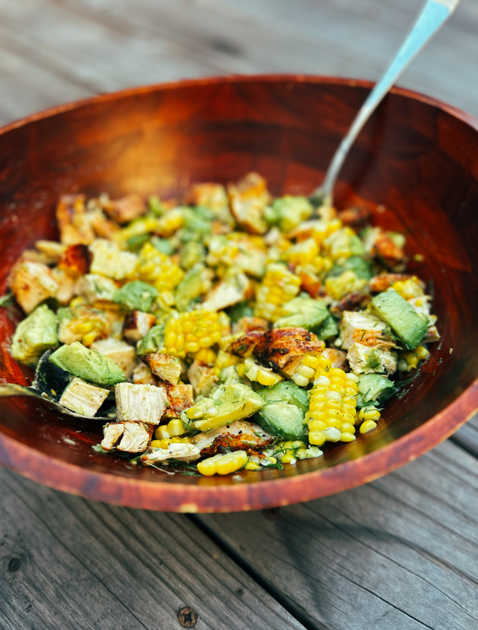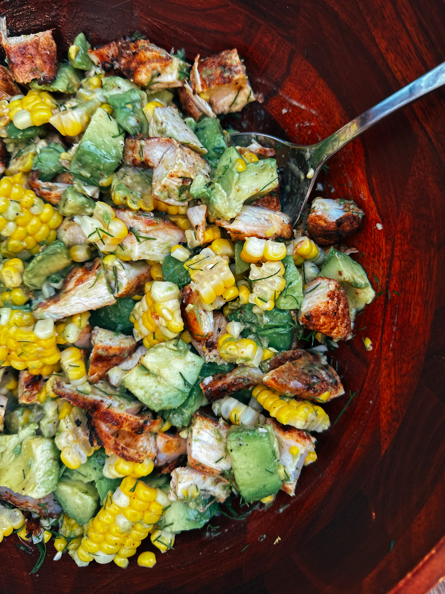 This week we ended up with a simple grilled chicken and corn salad. We didn’t grill the corn since our BBQ isn’t large enough but essentially you grill corn and chicken, toss with some avocado and dressing, then viola! It’s a salad. It’s a protein. It’s a main character. Or even a side one if you are looking to bring something to your next group gathering.