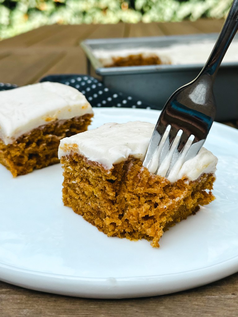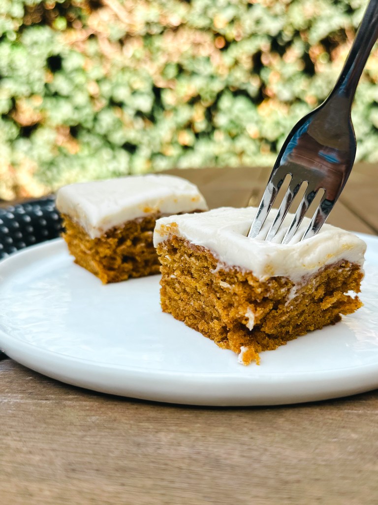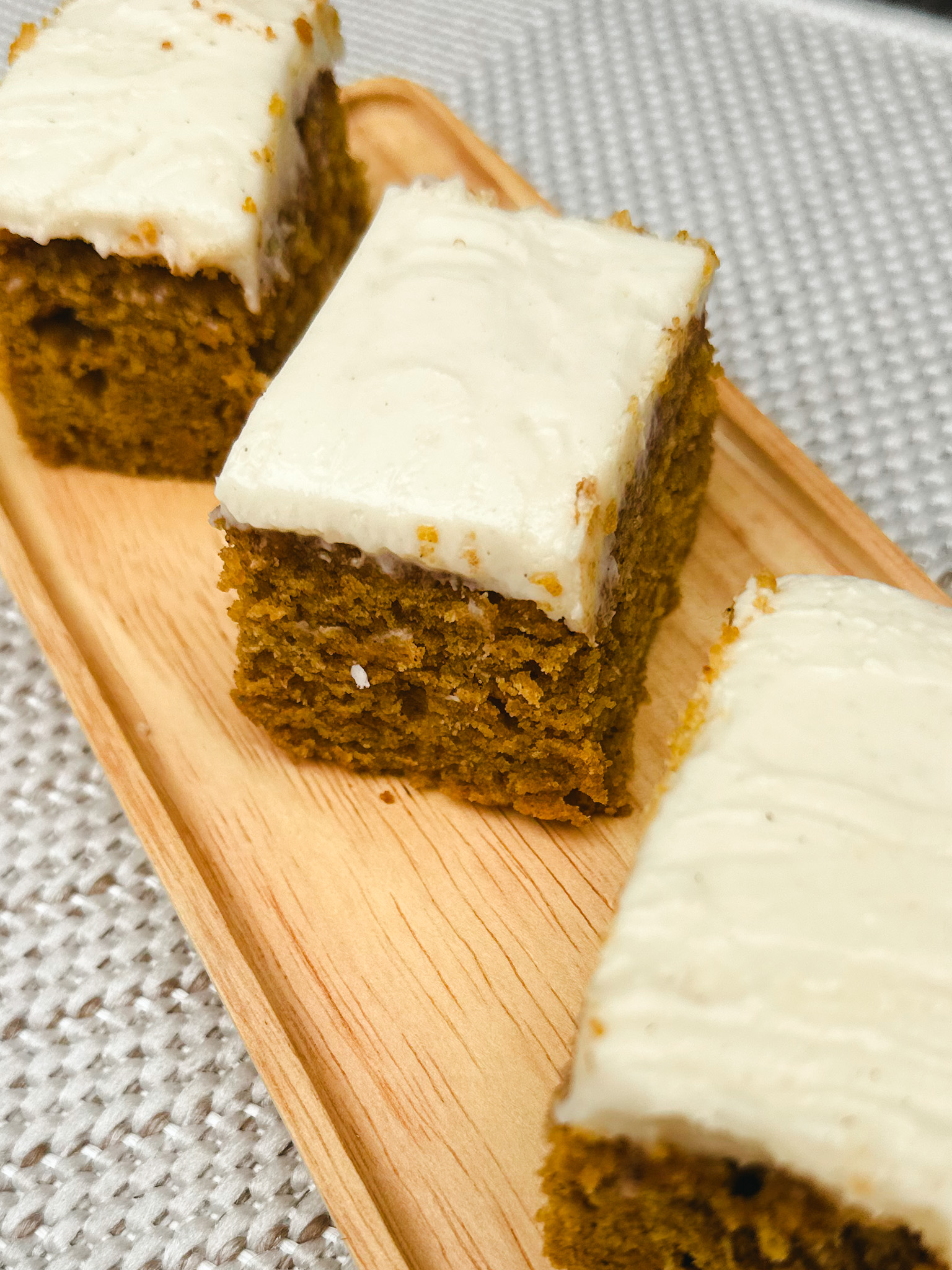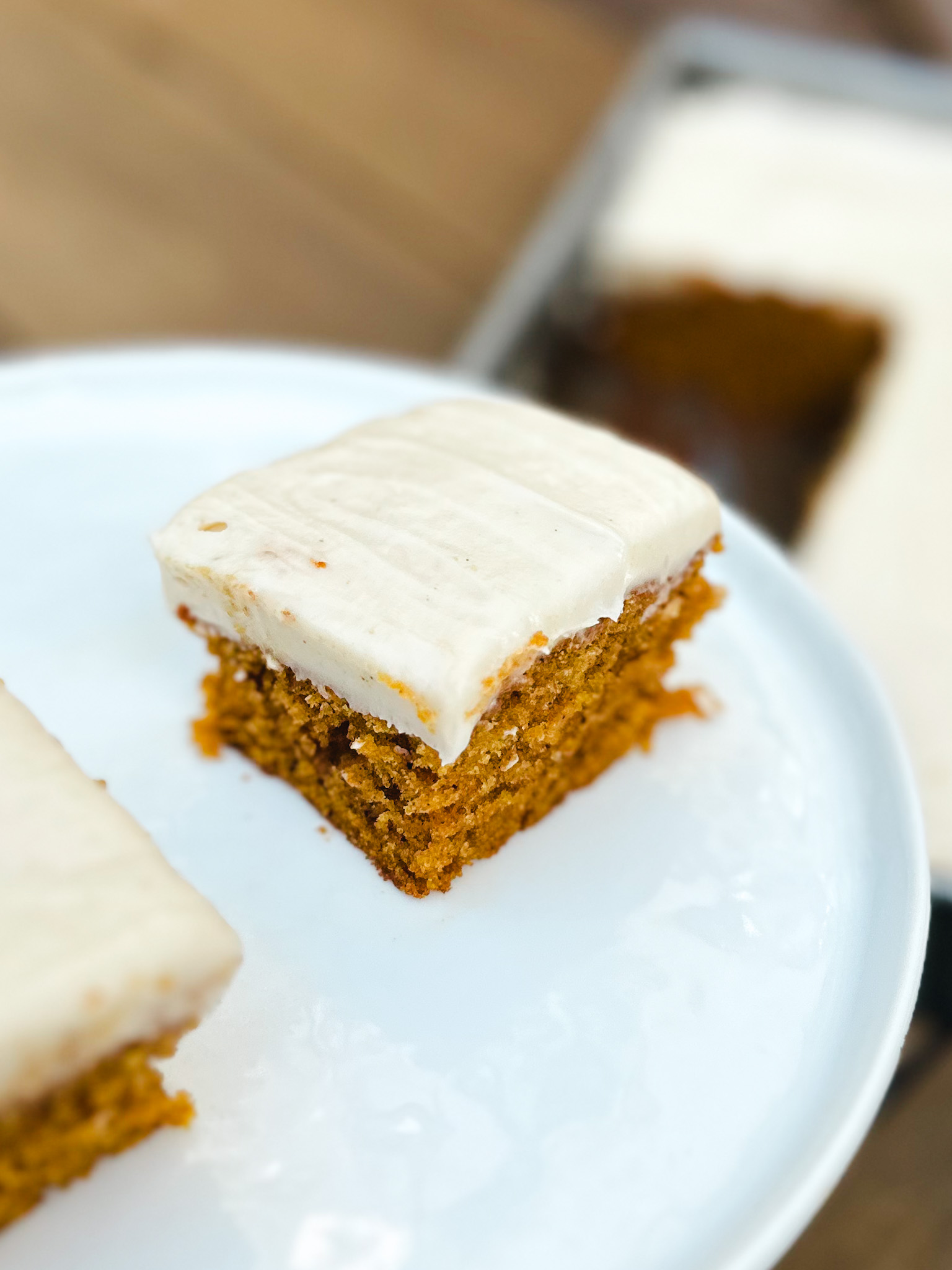 These pumpkin bars are very easy to make and hit all the right notes – the pumpkin layer is moist with just enough of your favorite fall spices: cinnamon, nutmeg, pumpkin. And the cream cheese frosting layer is… well cream cheese frosting. I think the secret sauce to this recipe is really the frosting. We use this cream cheese frosting recipe for any recipe that requires it – red velvet cake, carrot cake, etc. It’s not too sweet but still packs a punch, and elevates the very scrumptious pumpkin bar base. The base is cake-like. It’s not dense at all (a true FEAT when it comes to GF baking), and I can honestly say, I have yet to try a professional bakery’s pumpkin cake anything that has this fluffy texture. We are in fact the professionals!