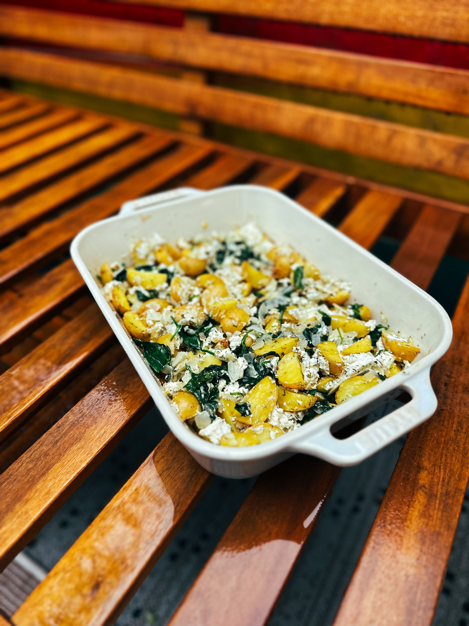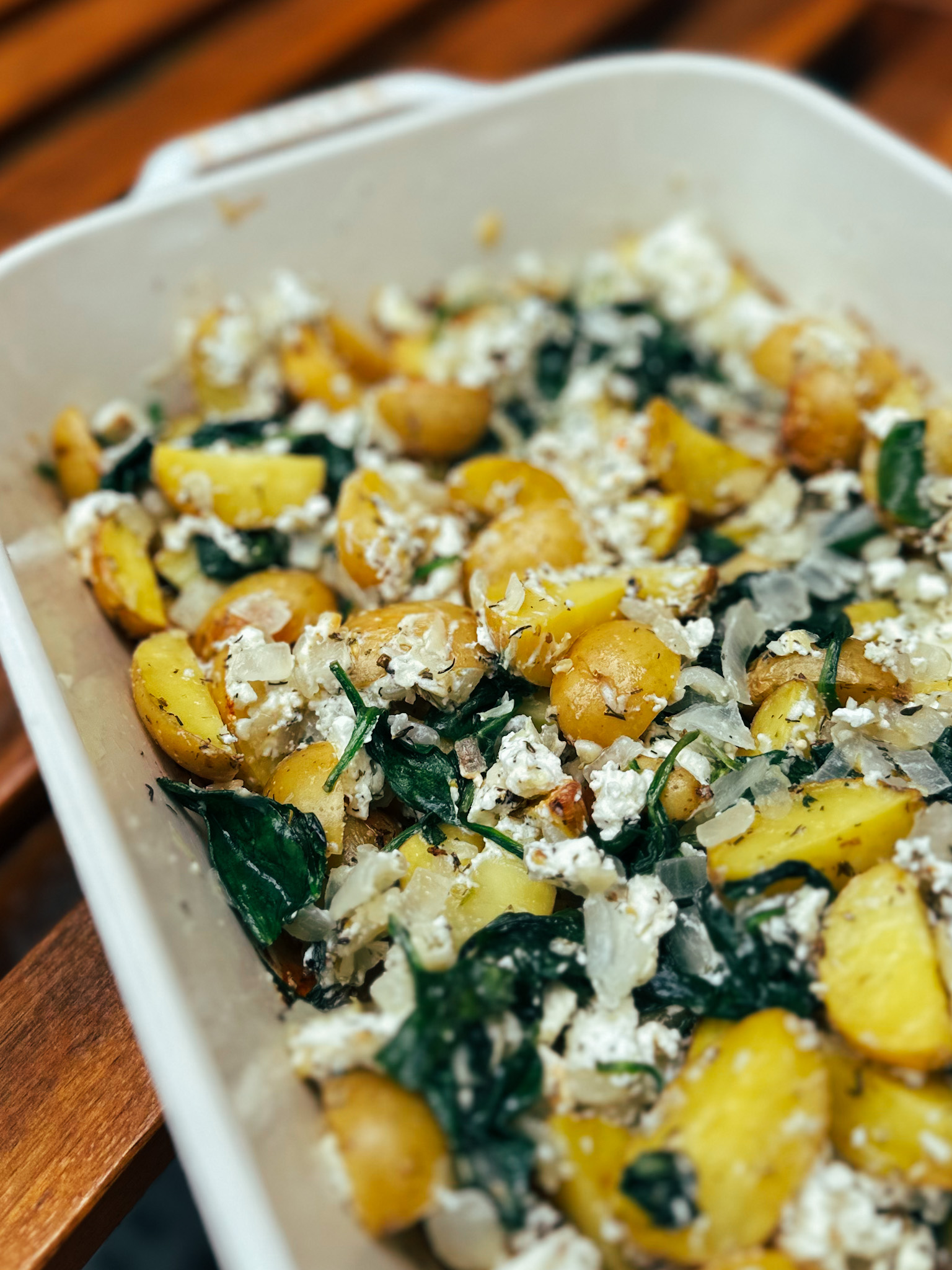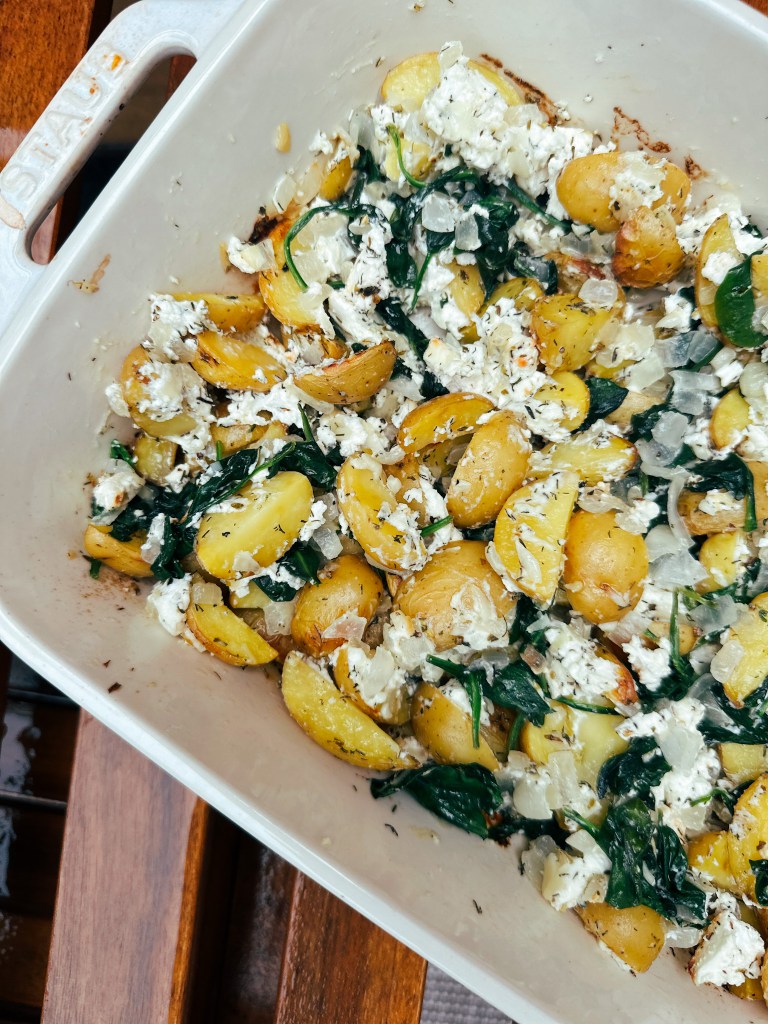 - Remove potatoes from the oven and combine the onions/spinach with the potatoes/feta, gently stirring until combined.