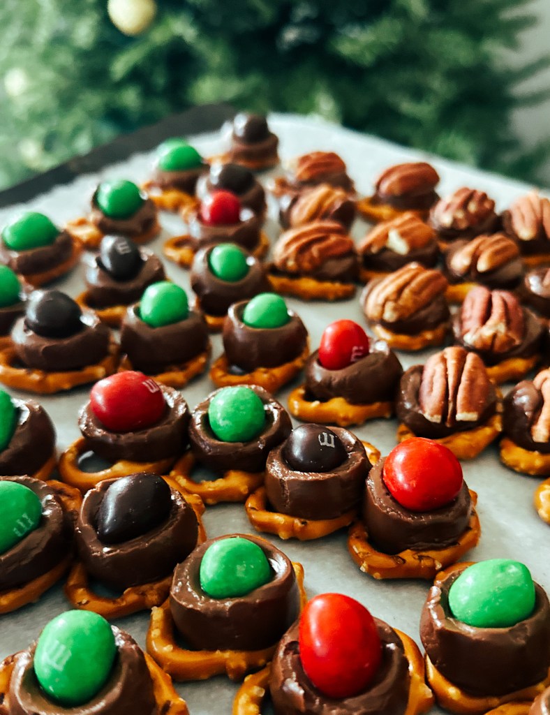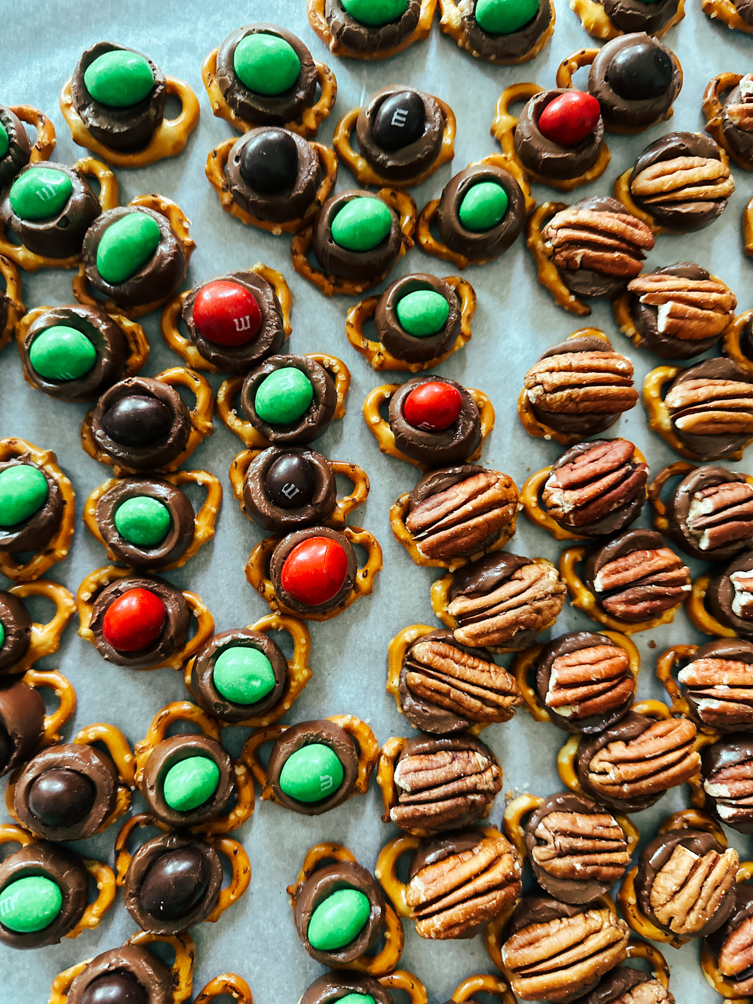 - Lightly press M&Ms and/or pecans on top of the slightly melted rolo.
