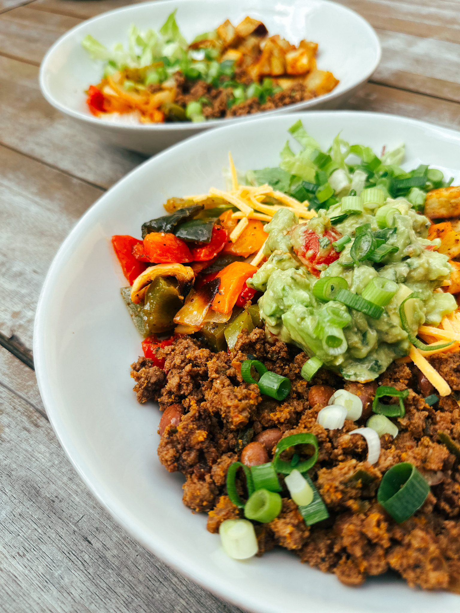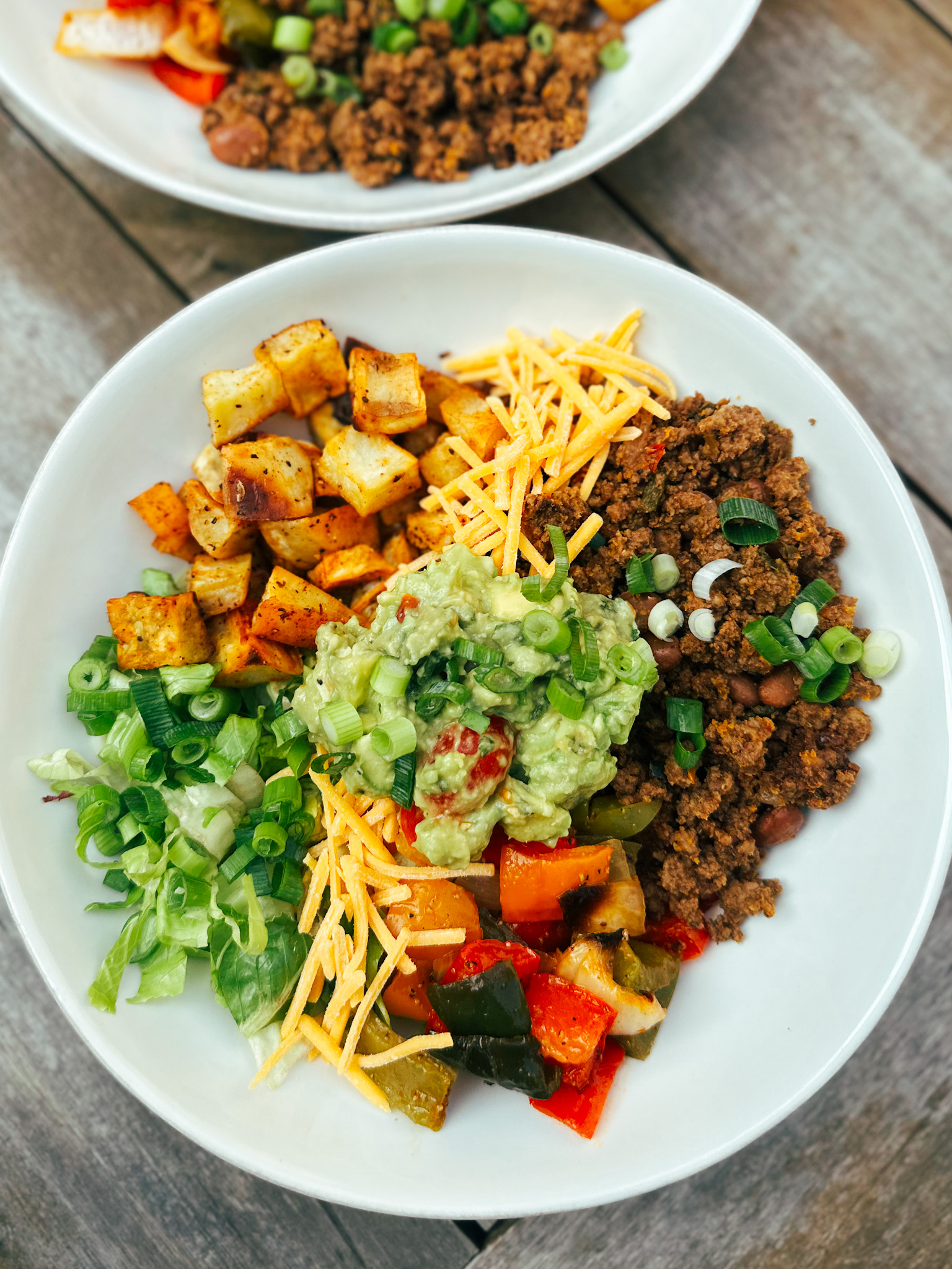 - Fill your plate with a bed of romaine, then top with the baked vegetables, cooked taco meat, some cheese, scallions, and of course, a large dollop of guacamole. Enjoy!