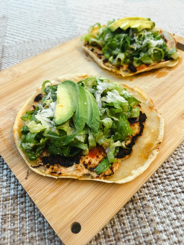 - Once all the tacos are cooked, top with a large scoop of caesar salad, sliced avocado, and additional parmesan. Enjoy!